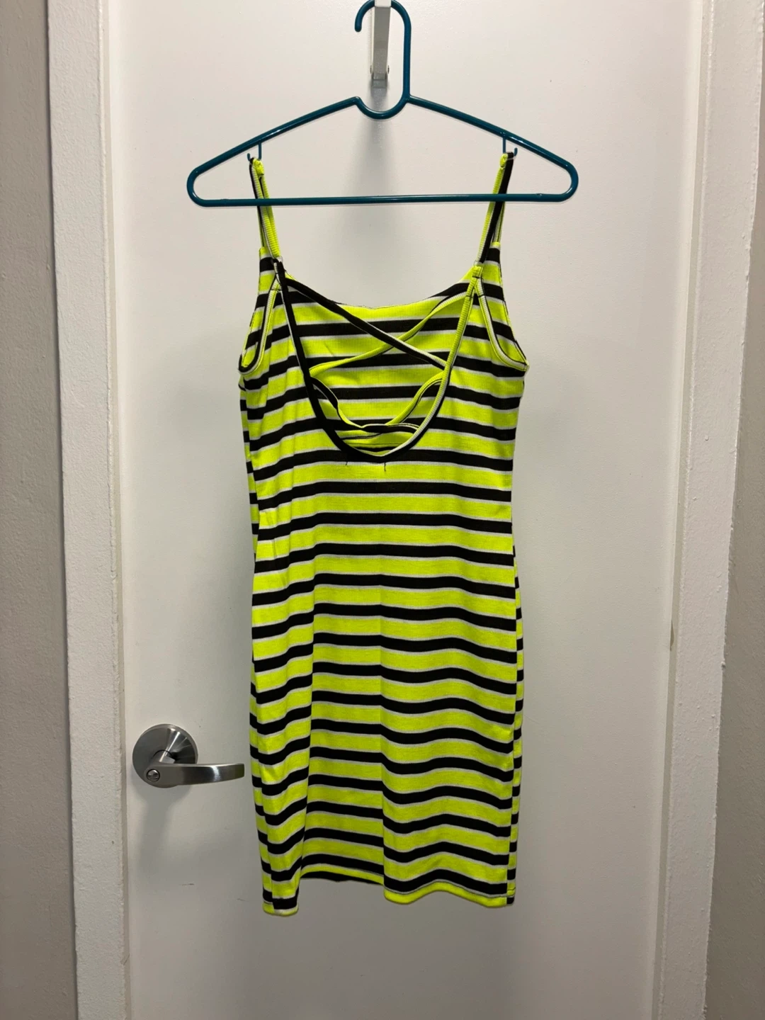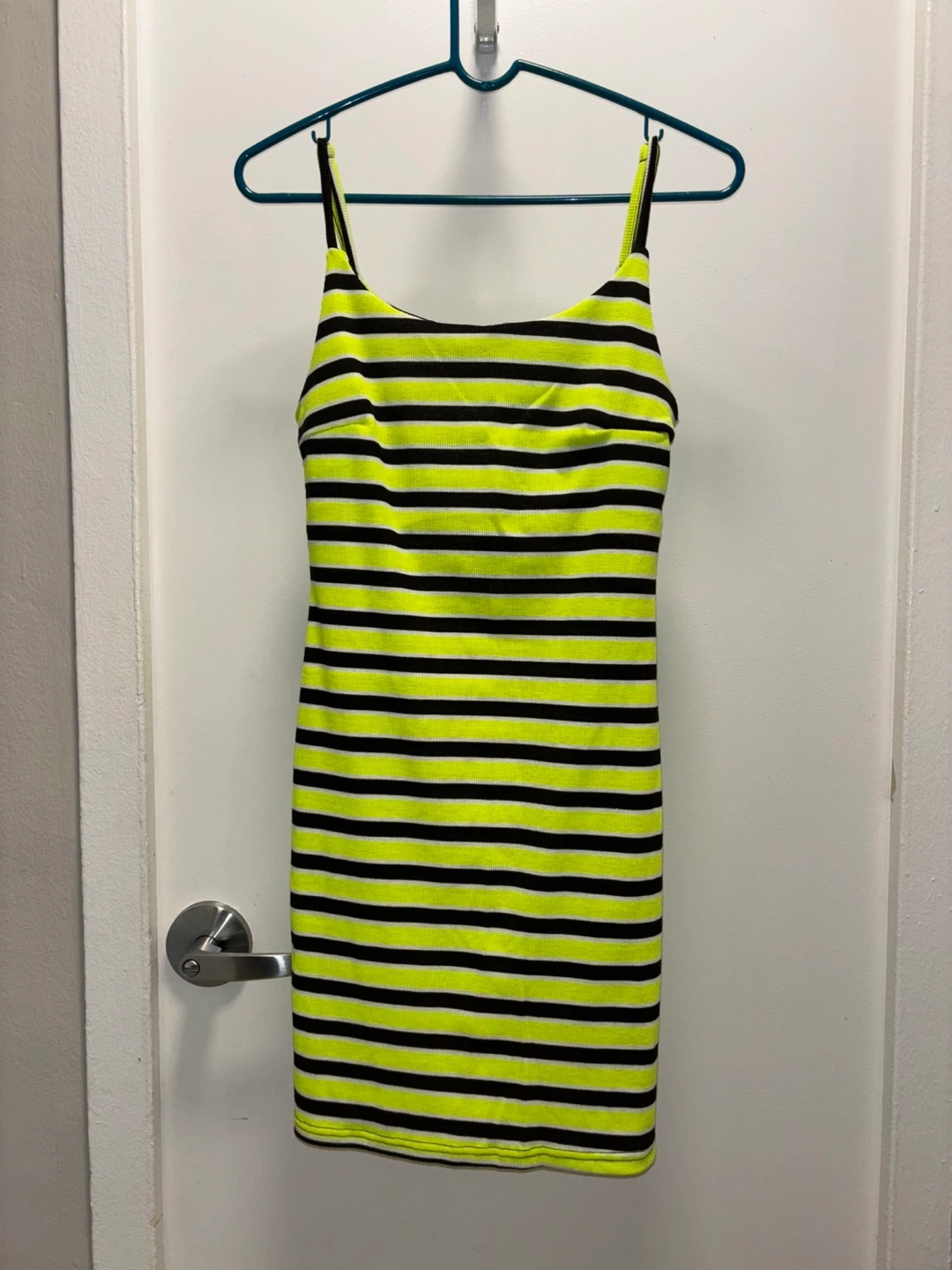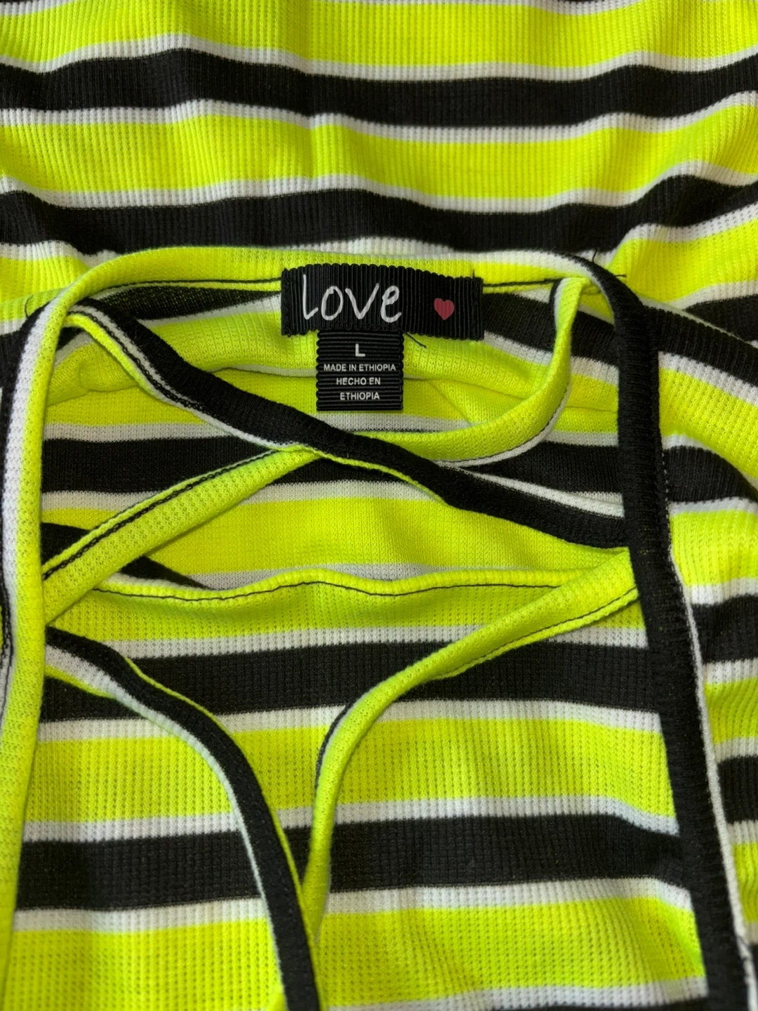 This is a Love brand women's bodycon dress. It features a black and neon yellow stripe pattern. The dress is a size L and made in Ethiopia. Gently used/ like new.