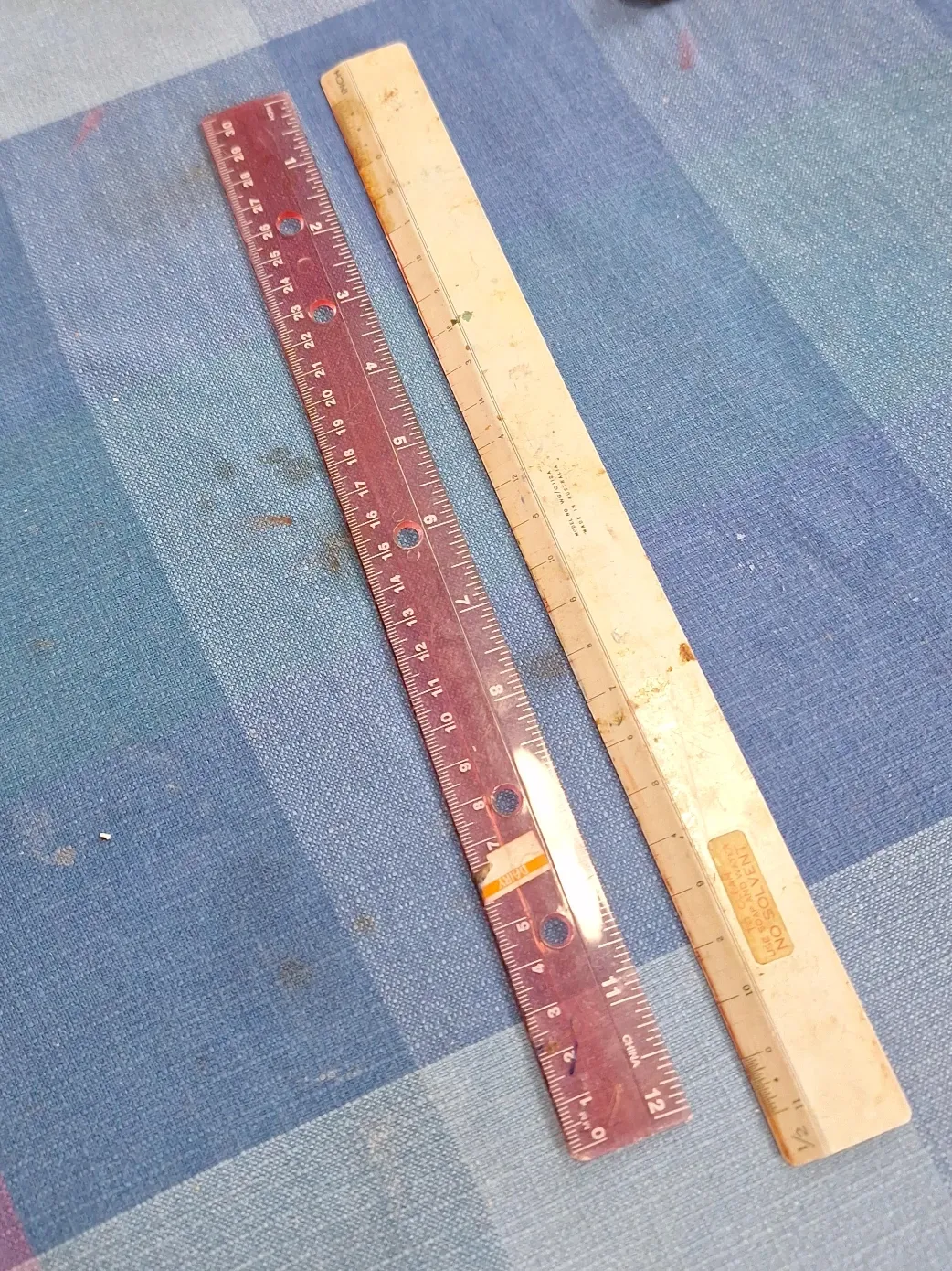 Includes a transparent red plastic ruler marked in inches and centimeters, made in China. Also includes a cream-colored metal ruler, 12 inches long, made in Australia. The metal ruler has instructions for cleaning: use soap and water, no solvent.