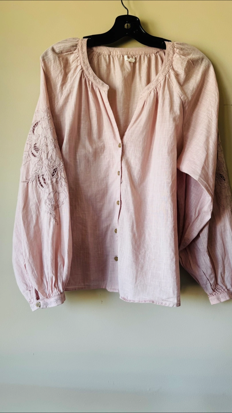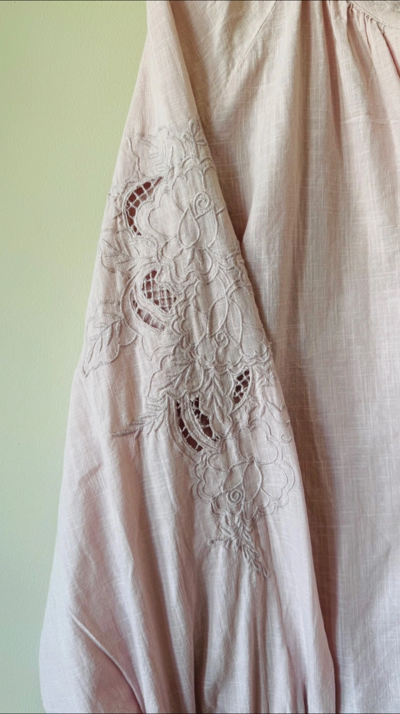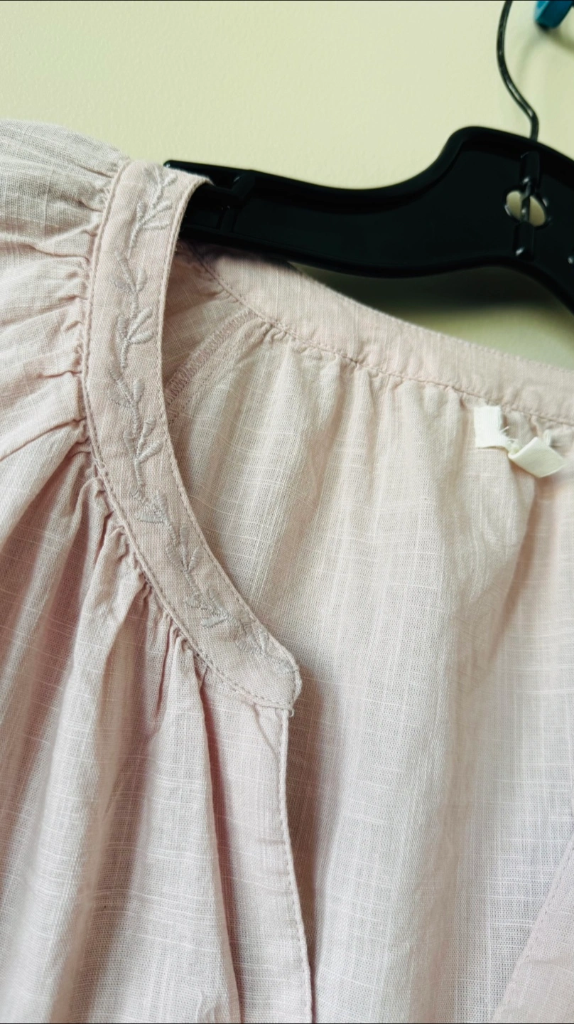 Here's a lovely light pink blouse with embroidered detailing on the sleeves and neckline. Perfect for adding a touch of elegance to your wardrobe!