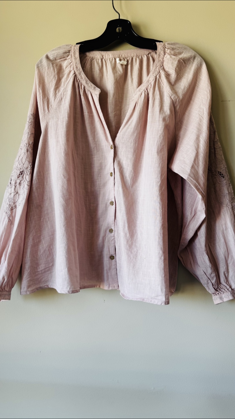 Here's a lovely light pink blouse with embroidered detailing on the sleeves and neckline. Perfect for adding a touch of elegance to your wardrobe!