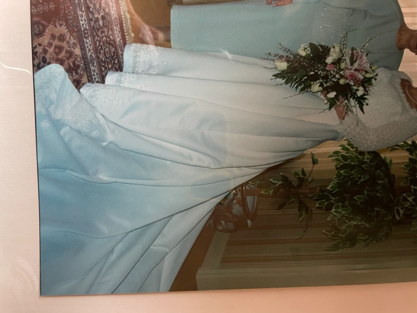 Beautiful white wedding dress featuring intricate lace detailing throughout. It has elegant long sleeves and a full skirt. This dress is perfect for a bride seeking a classic and romantic look on her special day! Still in preservation box.
