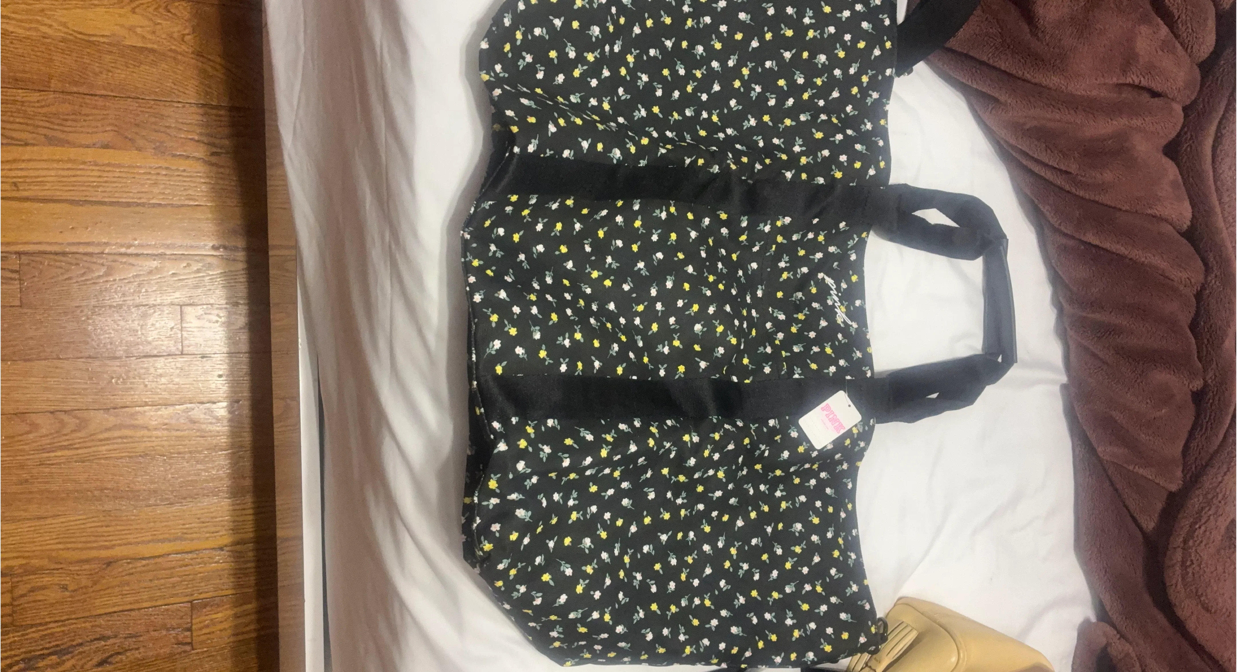 I'm selling a PINK Victoria's Secret tote bag! It features a cute floral pattern on a black background with black straps. Perfect for carrying your essentials in style. You can’t find these anymore.