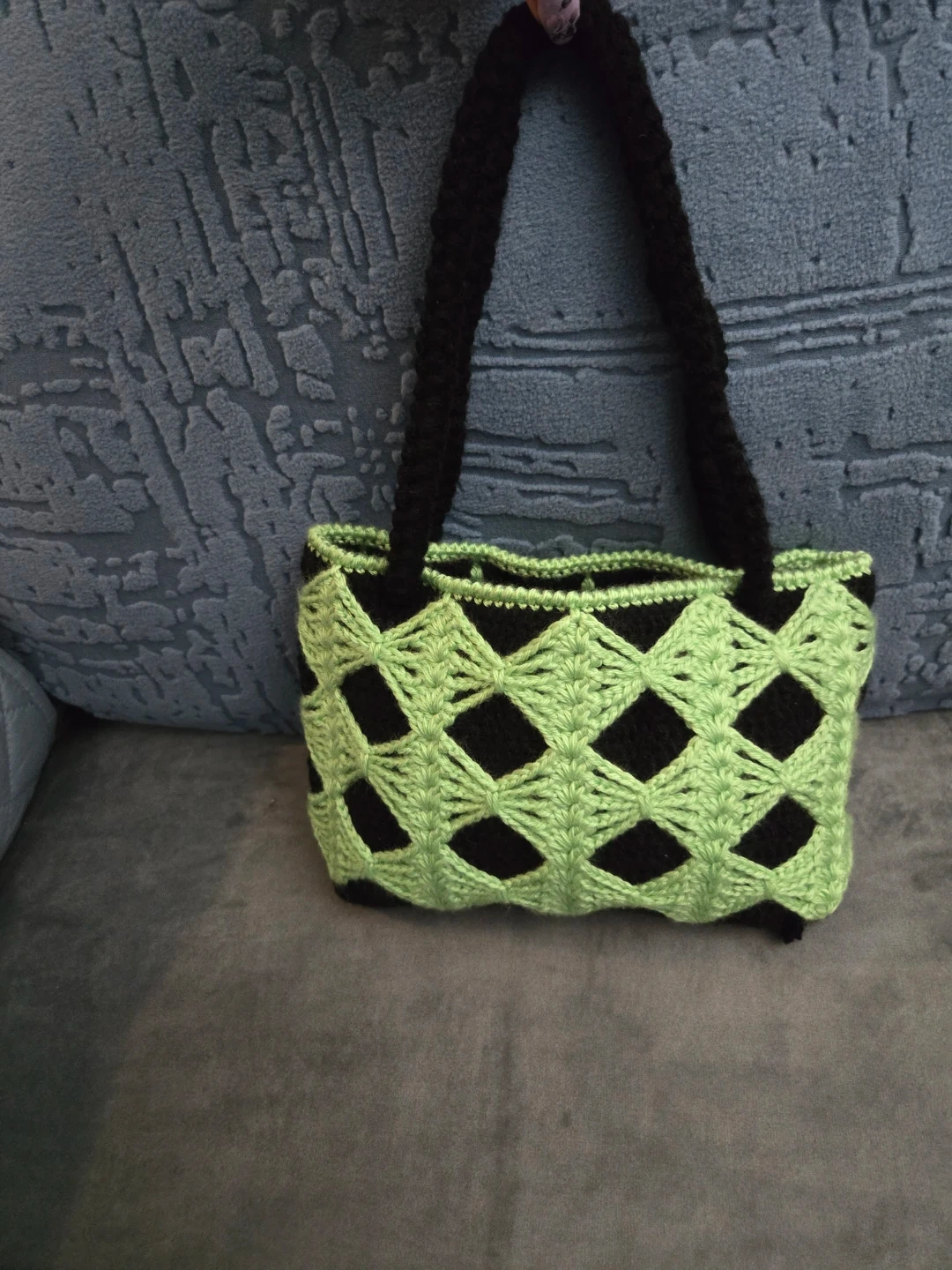handmade crochet purse in a beautiful lime green and black colour. Has a diamond pattern throughout. The braided straps are sturdy, comfortable and allow the purse to be worn as a crossbody/shoulder purse or a handbag