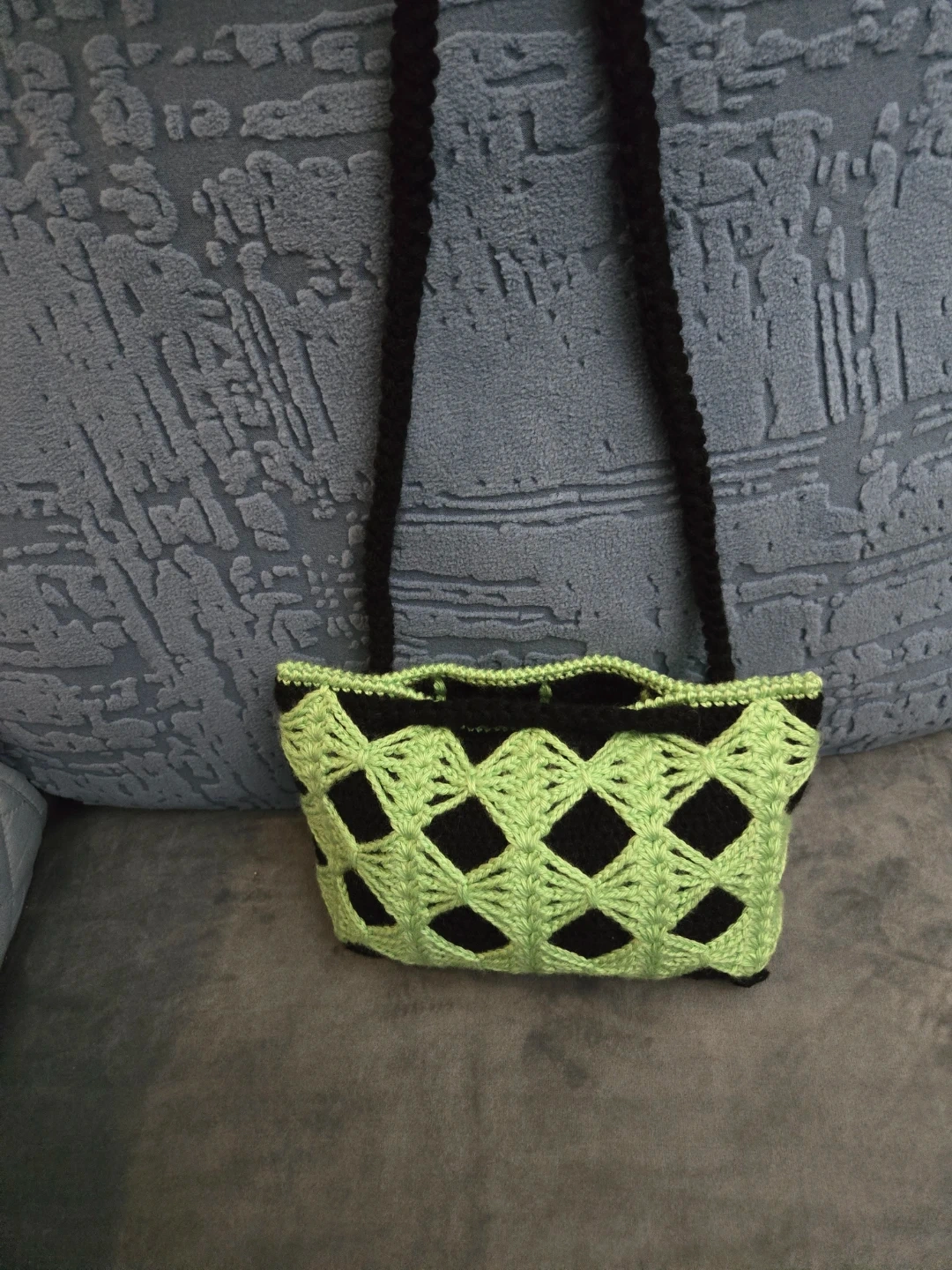 handmade crochet purse in a beautiful lime green and black colour. Has a diamond pattern throughout. The braided straps are sturdy, comfortable and allow the purse to be worn as a crossbody/shoulder purse or a handbag