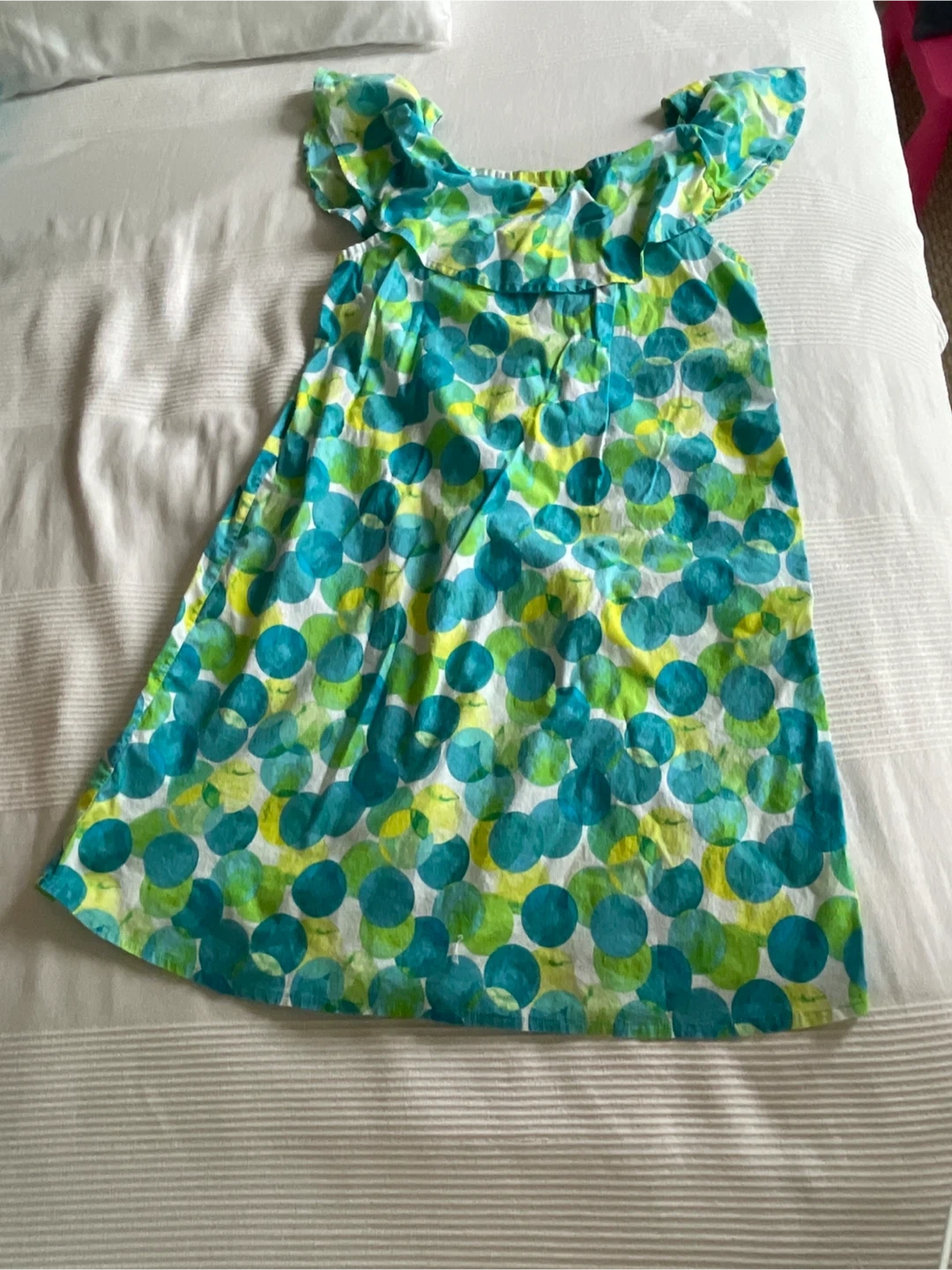 Adorable kids bubble dress with a fun green, blue, and yellow polka dot pattern. It features a ruffled neckline and flutter sleeves. Made from a lightweight fabric, perfect for warm weather! Size is medium.