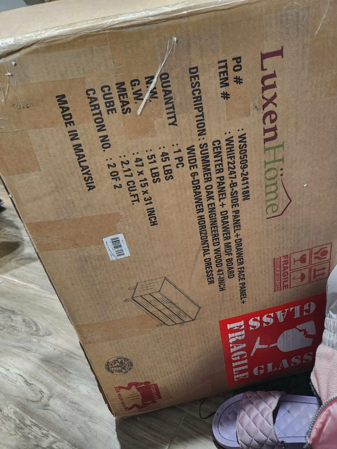 LuxenHome 6-drawer wide horizontal dresser in Summer Oak engineered wood. Dimensions are 47 x 15 x 31 inches. Includes original box.