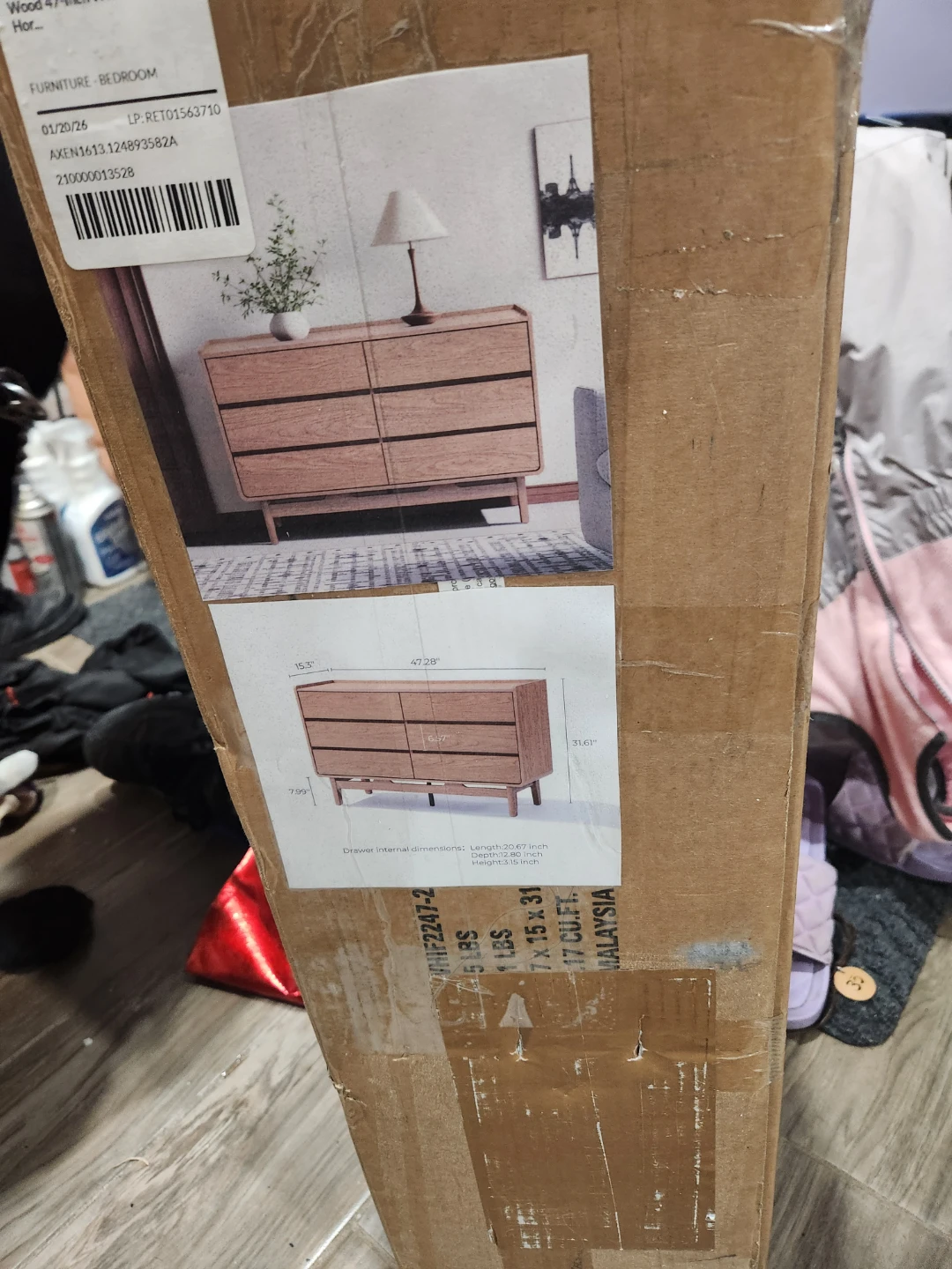 LuxenHome 6-drawer wide horizontal dresser in Summer Oak engineered wood. Dimensions are 47 x 15 x 31 inches. Includes original box.