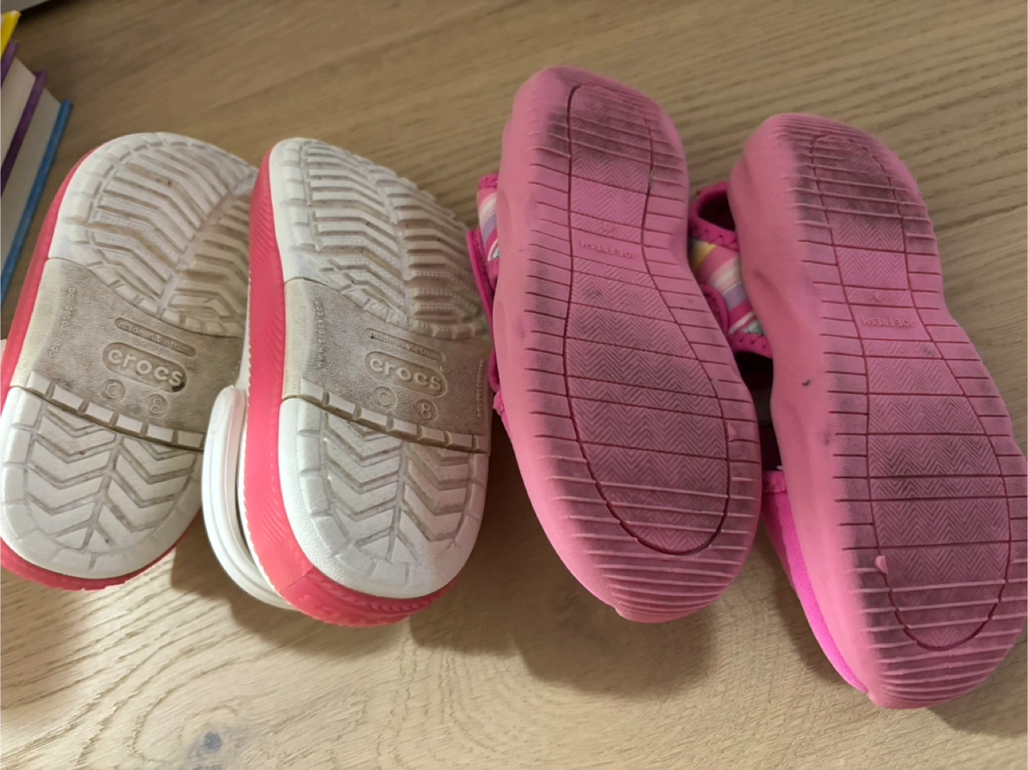 Two pairs of kids' footwear. Includes white Crocs with pink trim and pink striped water shoes. Both size C8