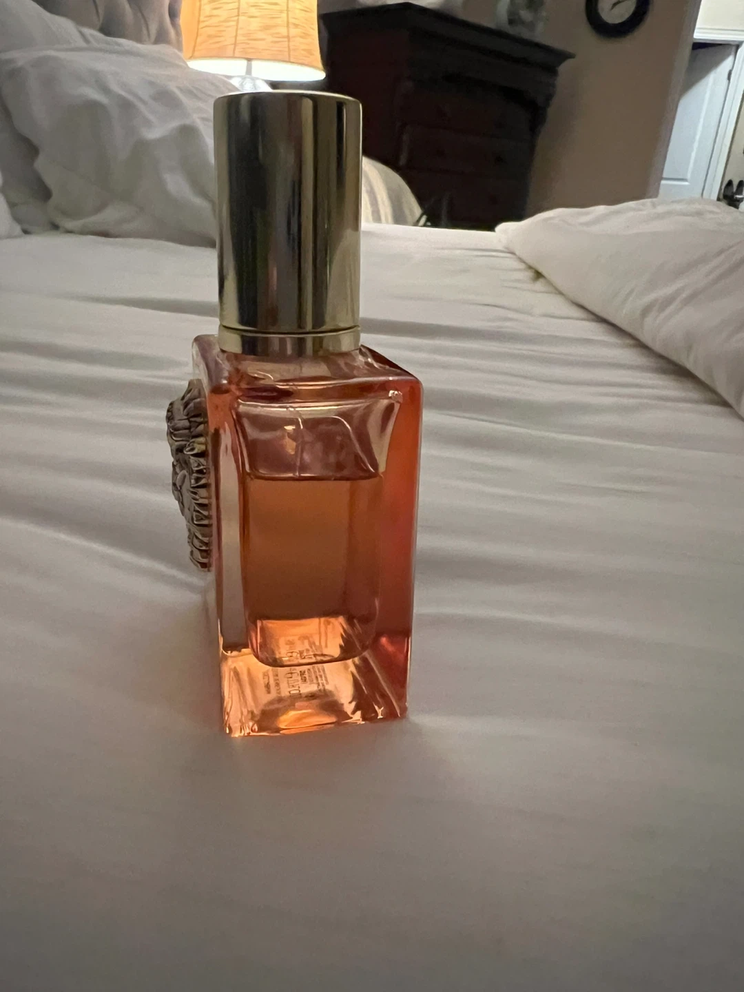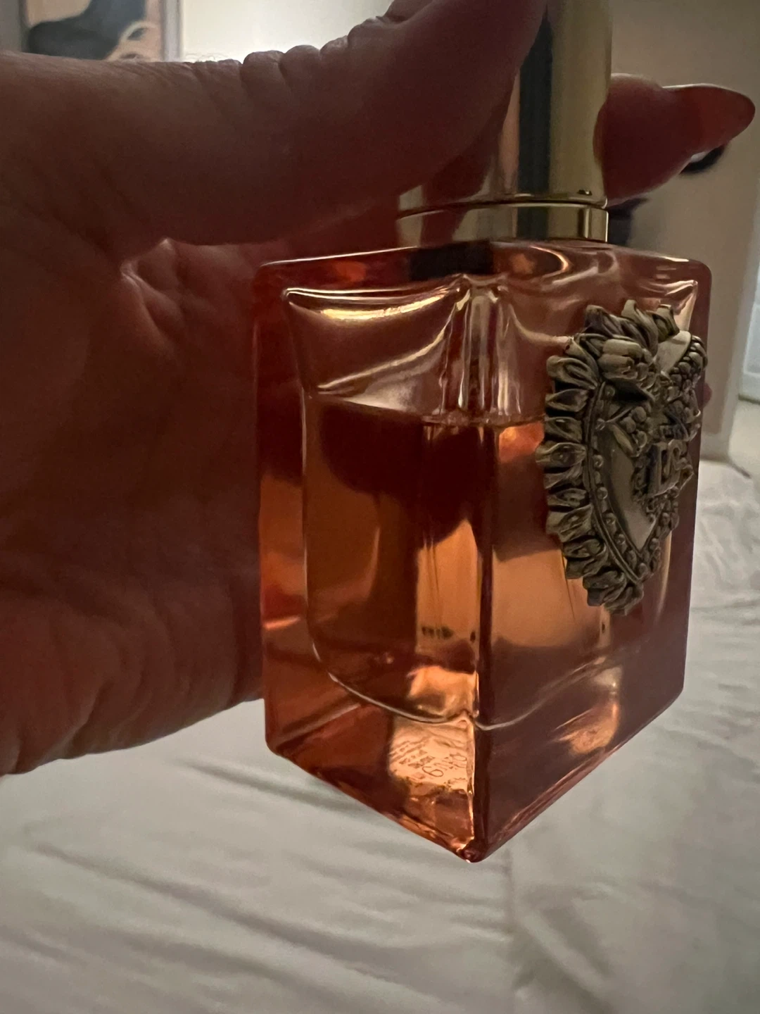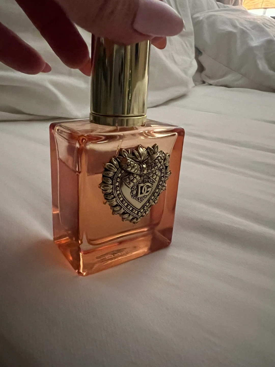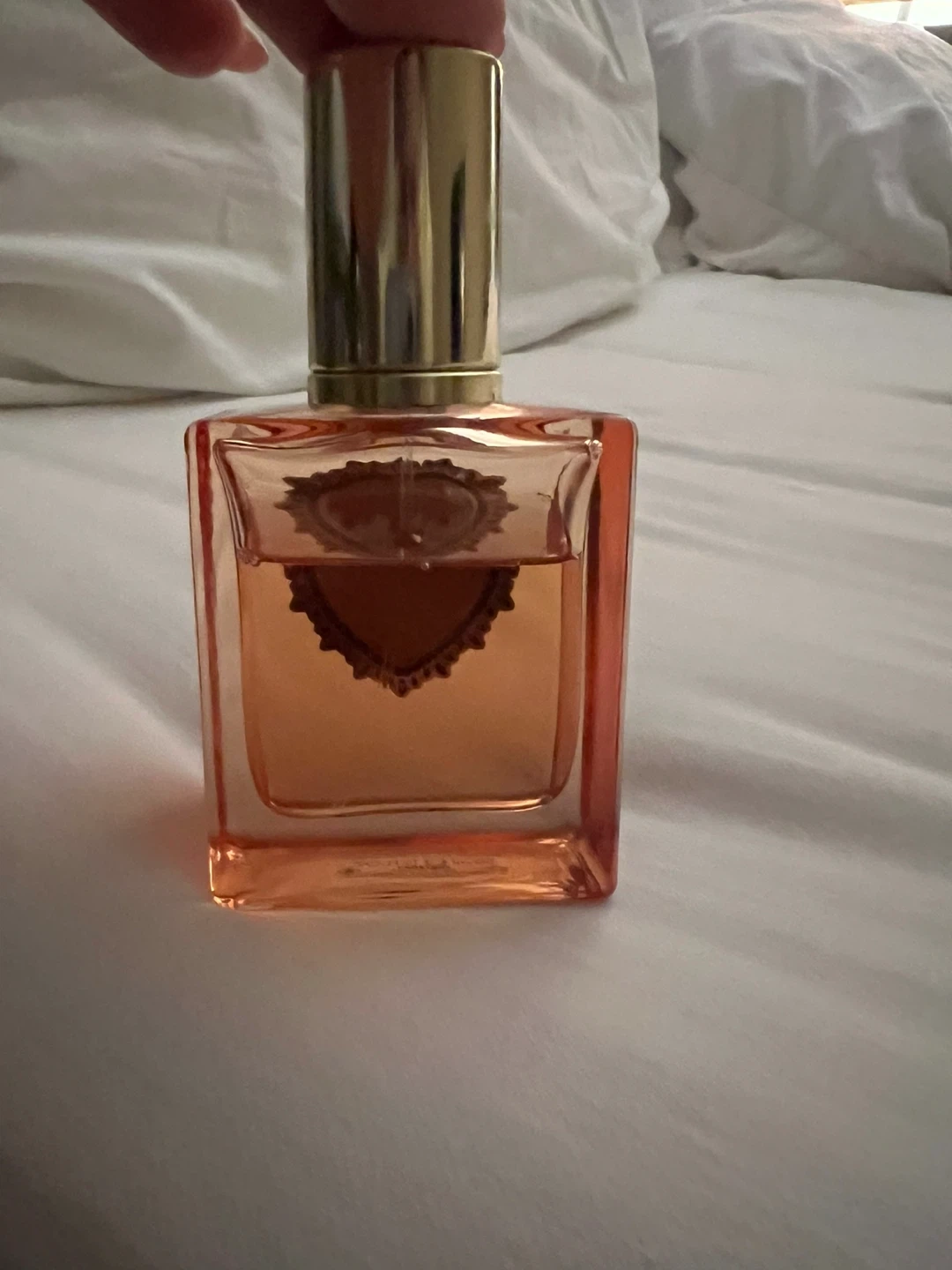 This is a bottle of Dolce & Gabbana devotion Eau de Parfum. It has a distinct heart-shaped emblem on the front. The liquid inside is a peachy-orange colour. 50 ml. Used.
