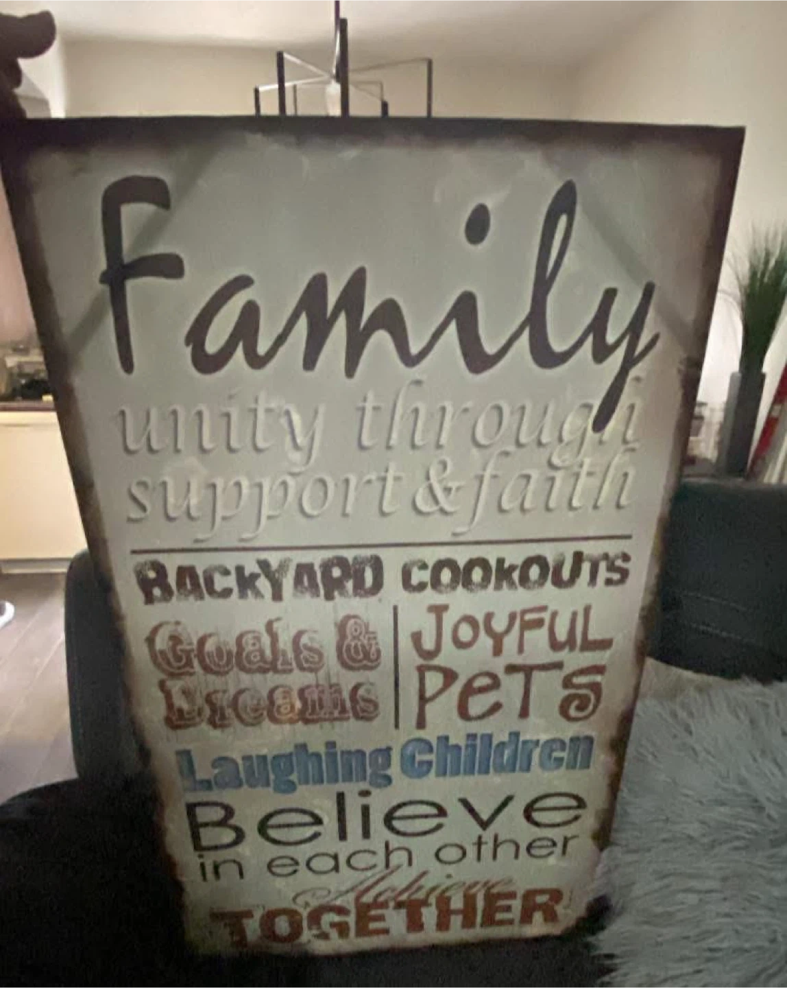 This rustic-style wall decor features the word "Family" prominently. It lists various life elements like "Backyard Cookouts," "Goals & Dreams," "Joyful Pets," and "Laughing Children." The central message is "Believe in each other, Achieve TOGETHER."