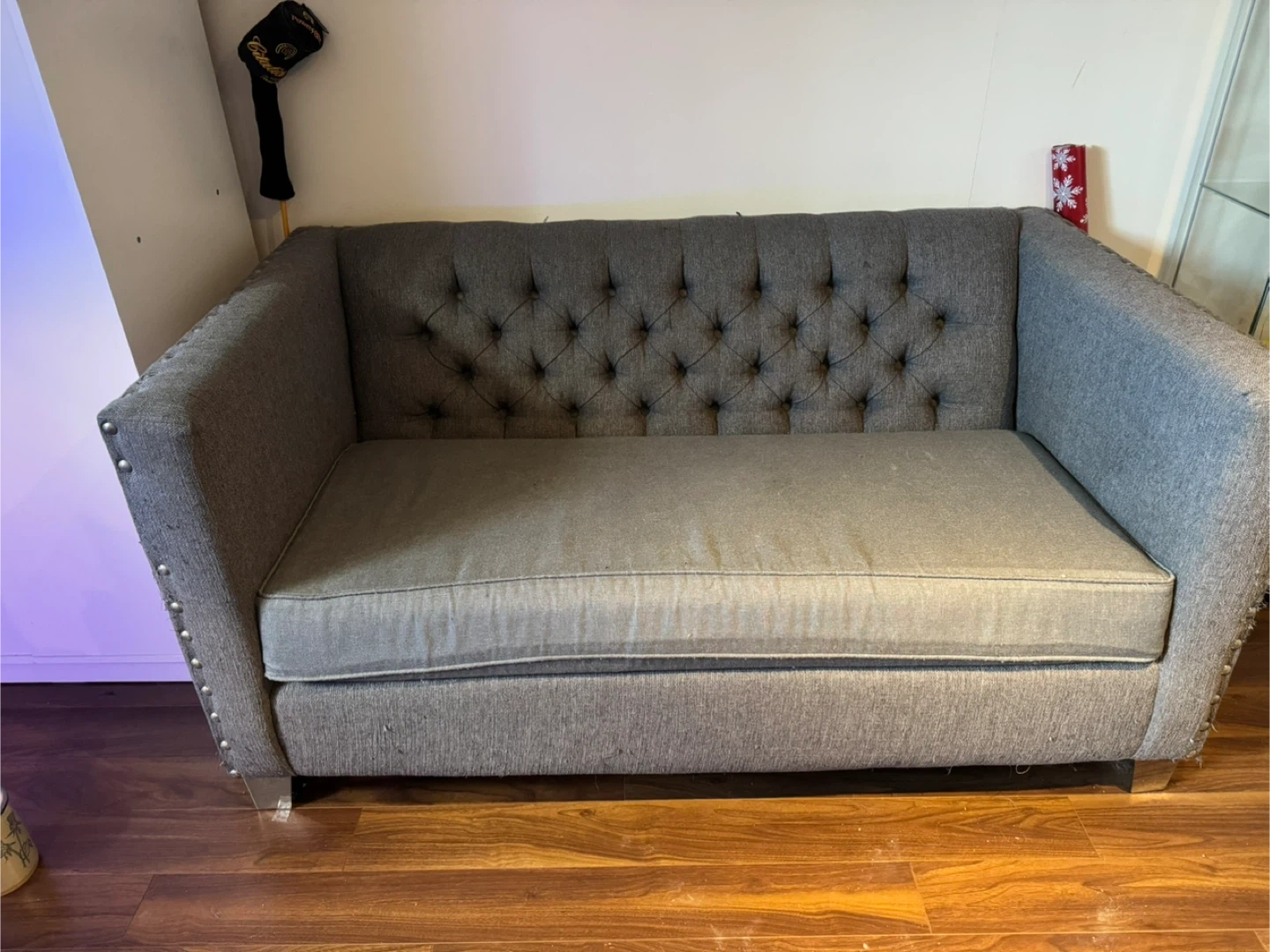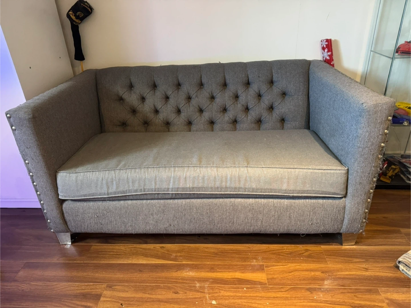 This grey loveseat features elegant tufting on the back and arms, accented with decorative nailhead trim. It's upholstered in a textured fabric and includes a comfortable seat cushion. Measures approximately 55" wide by 30" deep. As shown in pics, missing some studs and has been loved by a cat. Asking $150 OBO