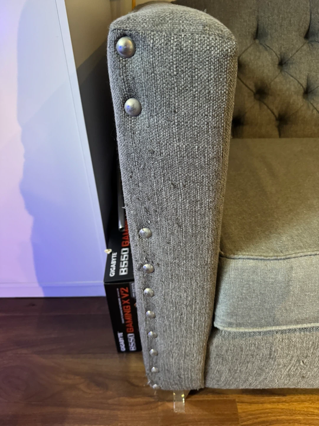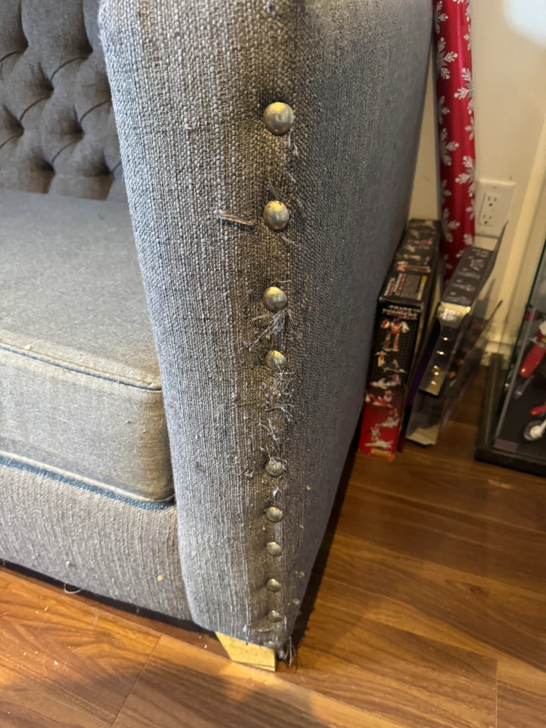 This grey loveseat features elegant tufting on the back and arms, accented with decorative nailhead trim. It's upholstered in a textured fabric and includes a comfortable seat cushion. Measures approximately 55" wide by 30" deep. As shown in pics, missing some studs and has been loved by a cat. Asking $150 OBO