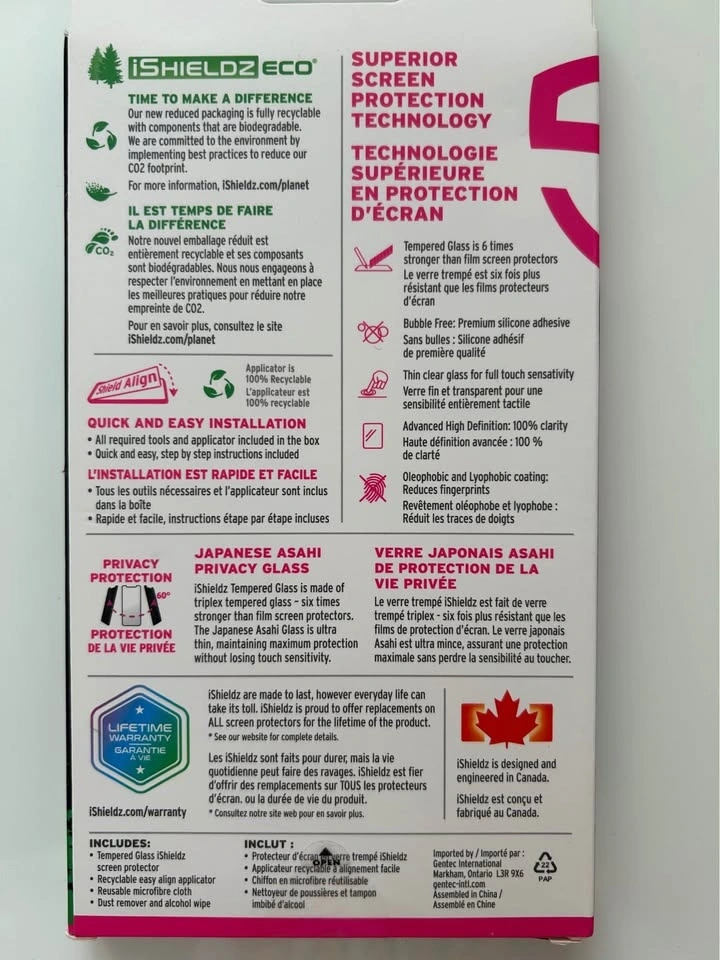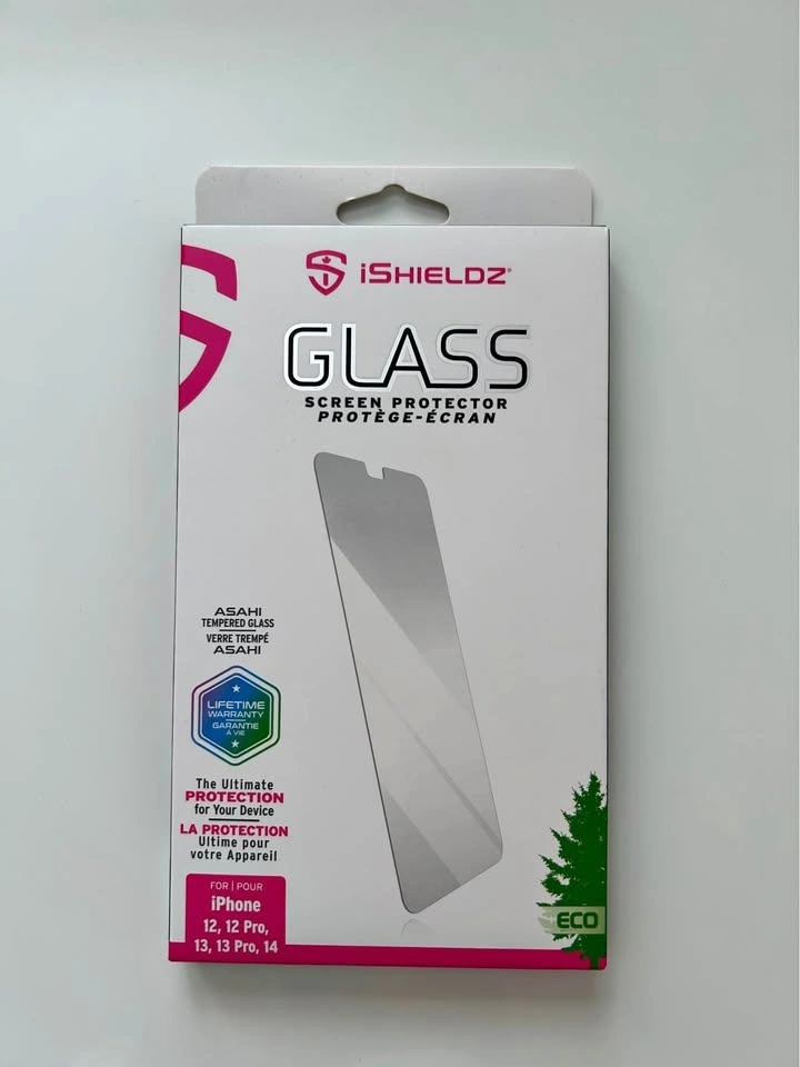 Brand new iSHIELDZ glass screen protector made with ASAHI tempered glass for ultimate protection, 6 times stronger than film protectors. Compatible with iPhone 12, 12 Pro, 13, 13 Pro, and 14. Includes a recyclable easy align applicator, microfibre cloth, dust remover, and alcohol wipe. Packaging is eco-friendly and biodegradable. Available for public meet-up in the Warden and Highway 7 area of Markham. Cash only.