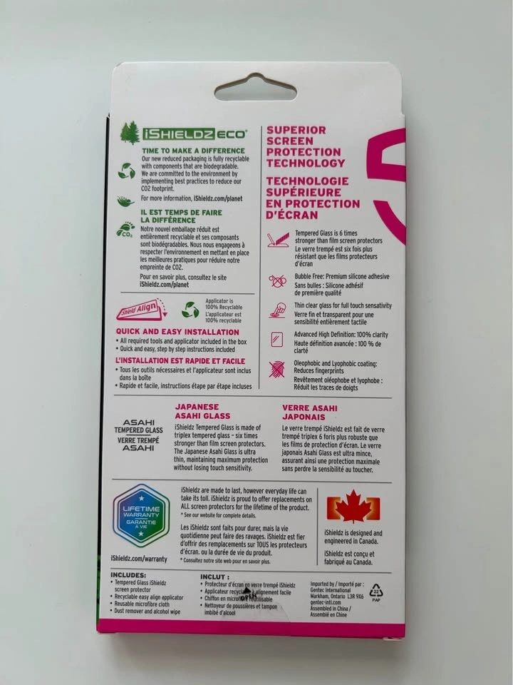 Brand new iSHIELDZ glass screen protector made with ASAHI tempered glass for ultimate protection, 6 times stronger than film protectors. Compatible with iPhone 12, 12 Pro, 13, 13 Pro, and 14. Includes a recyclable easy align applicator, microfibre cloth, dust remover, and alcohol wipe. Packaging is eco-friendly and biodegradable. Available for public meet-up in the Warden and Highway 7 area of Markham. Cash only.