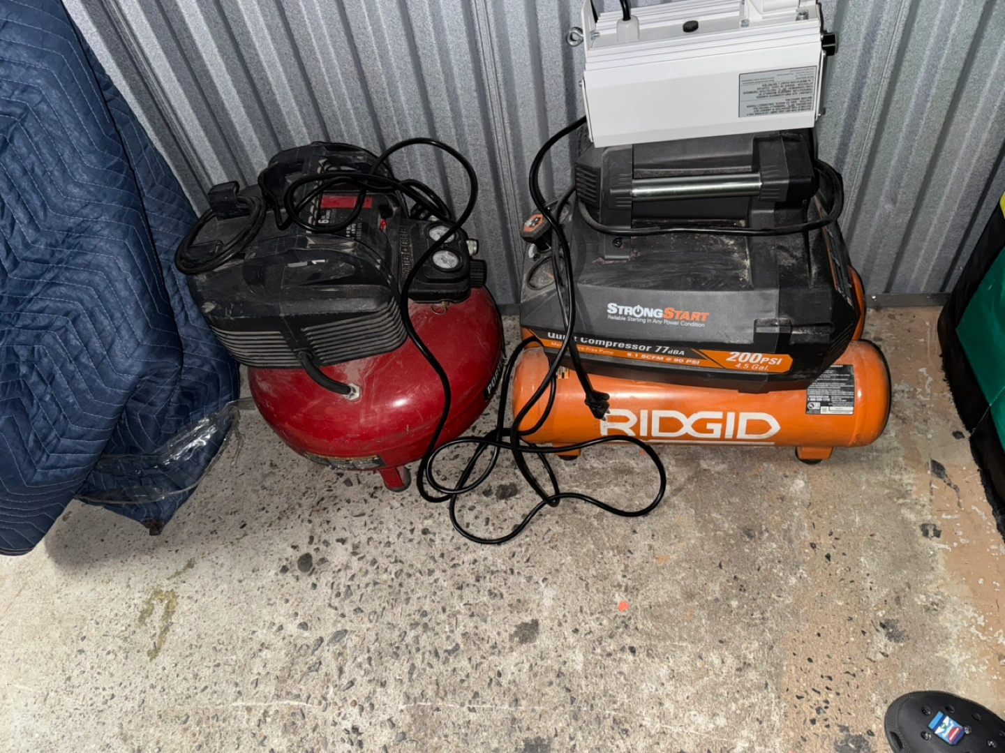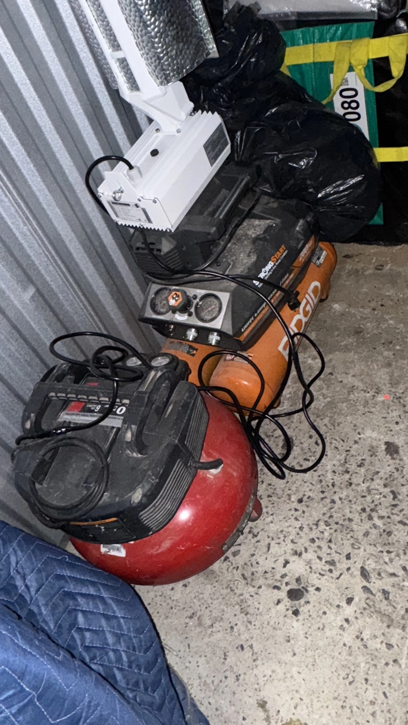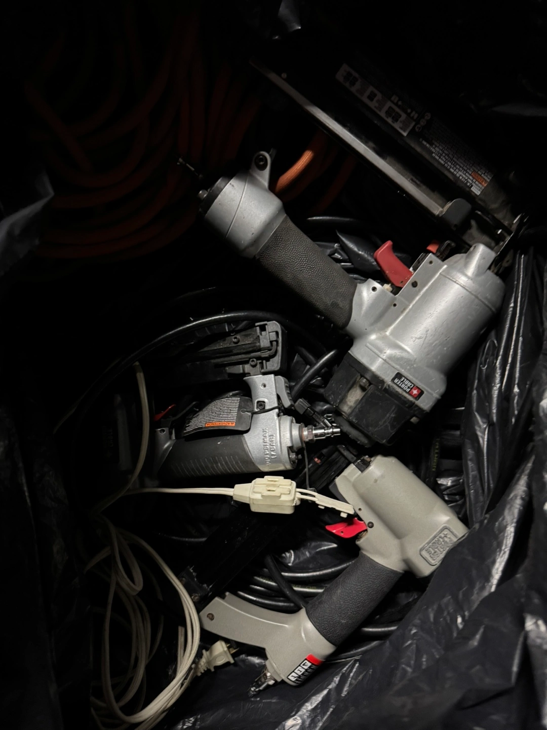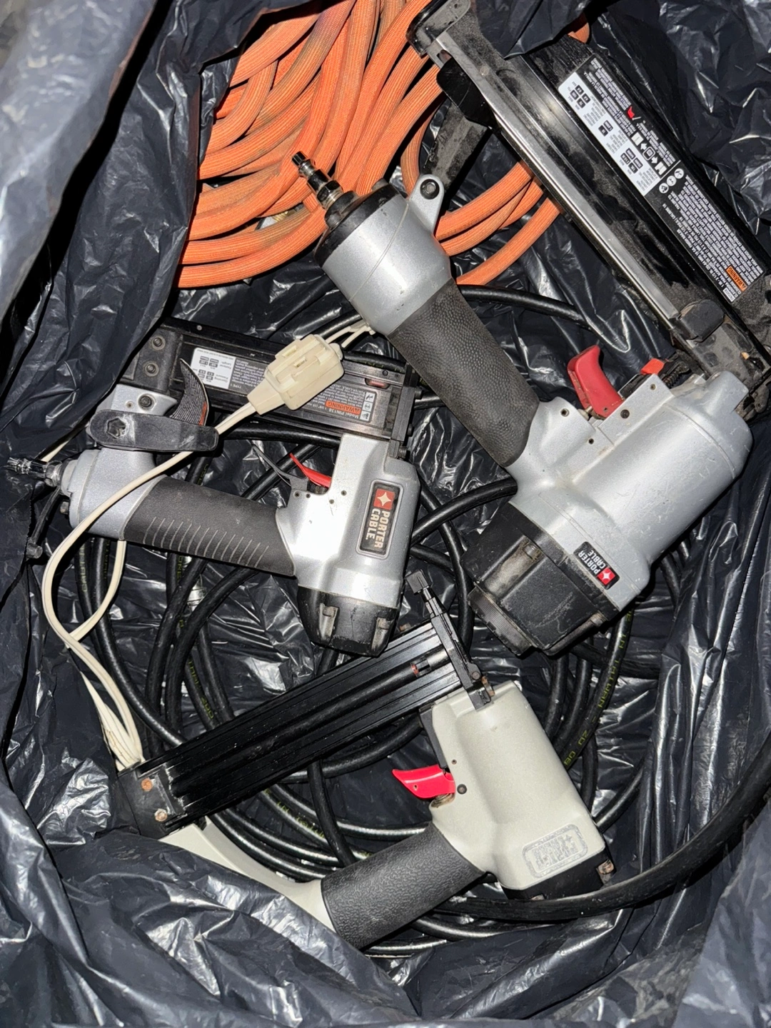 Several used pneumatic nailers and two air compressors. Includes various hoses and cords. $300 for everything