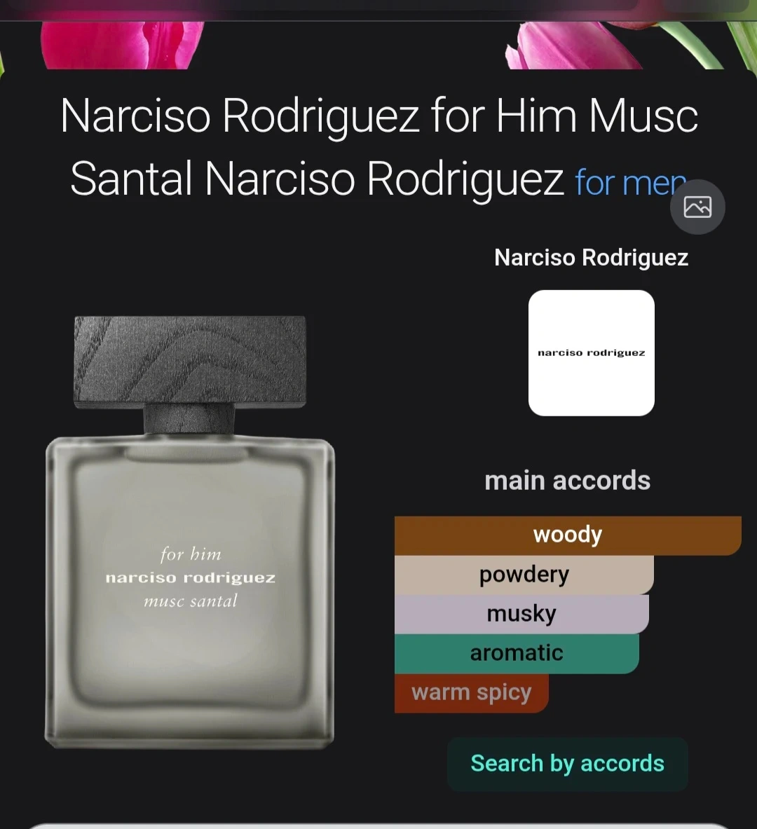 Narciso Rodriguez for Him Musc Santal by Narciso Rodriguez is a Woody Floral Musk fragrance for men. This is a new fragrance. Narciso Rodriguez for Him Musc Santal was launched in 2026. The nose behind this fragrance is Florian Gallo. Top notes are Clary Sage and Juniper Berries; middle note is Musk; base notes are Sandalwood and Cedar. Bought at shoppers drugmart