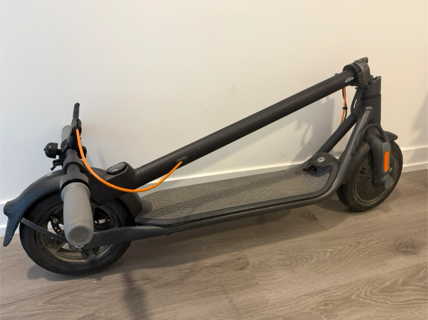 Segway Ninebot ES2 electric scooter in black. It's in used condition with some scuffs. The scooter is foldable for easy storage and transport. It's great for getting around town!