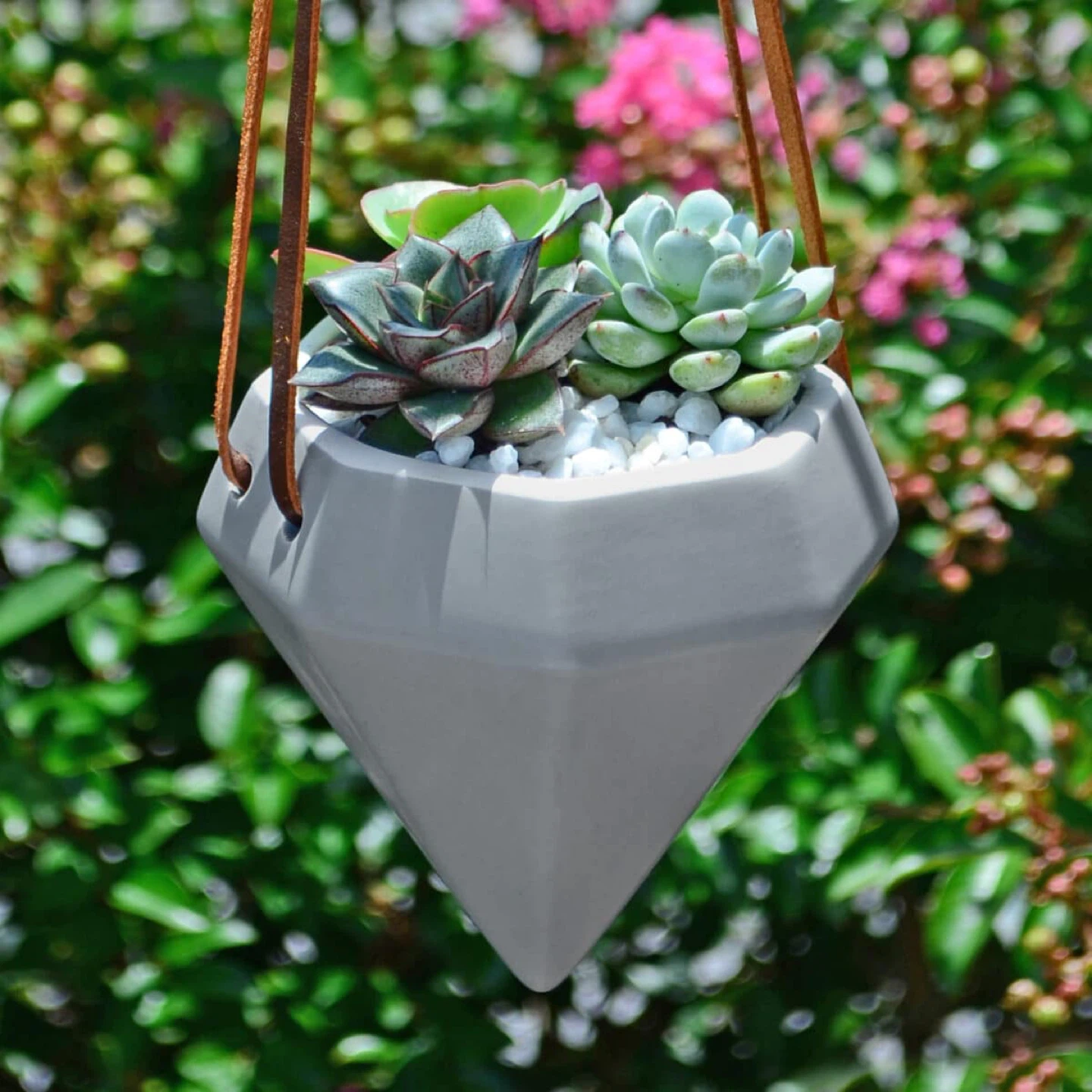 Set includes one light blue and one light grey diamond shaped hanging planters.