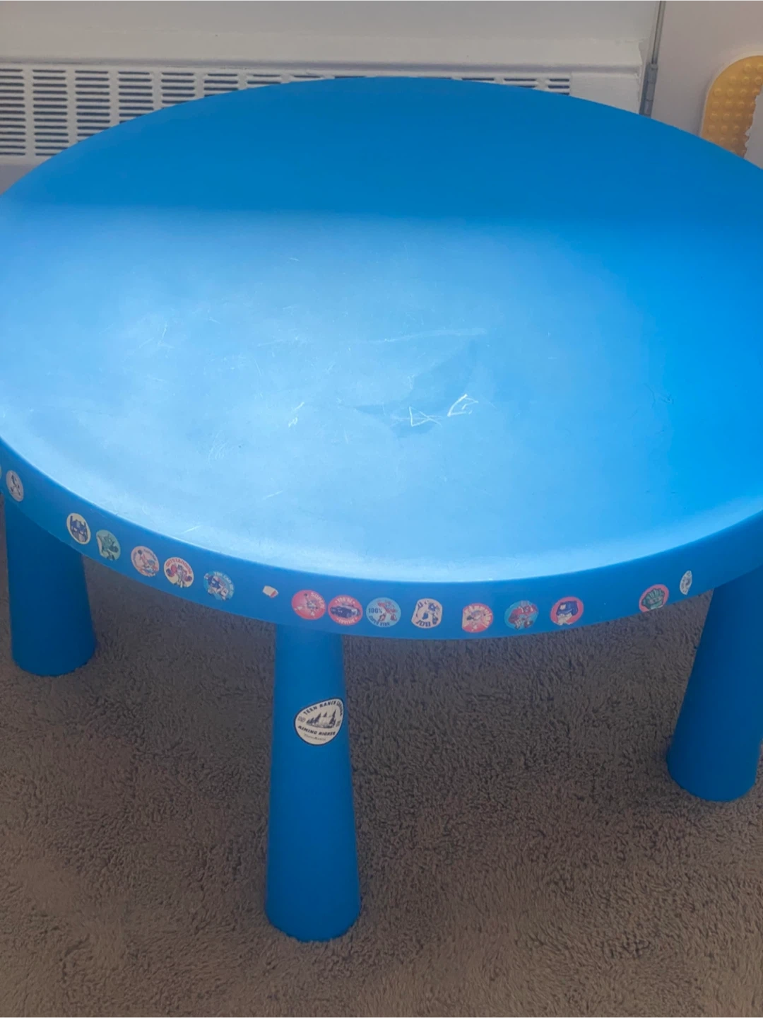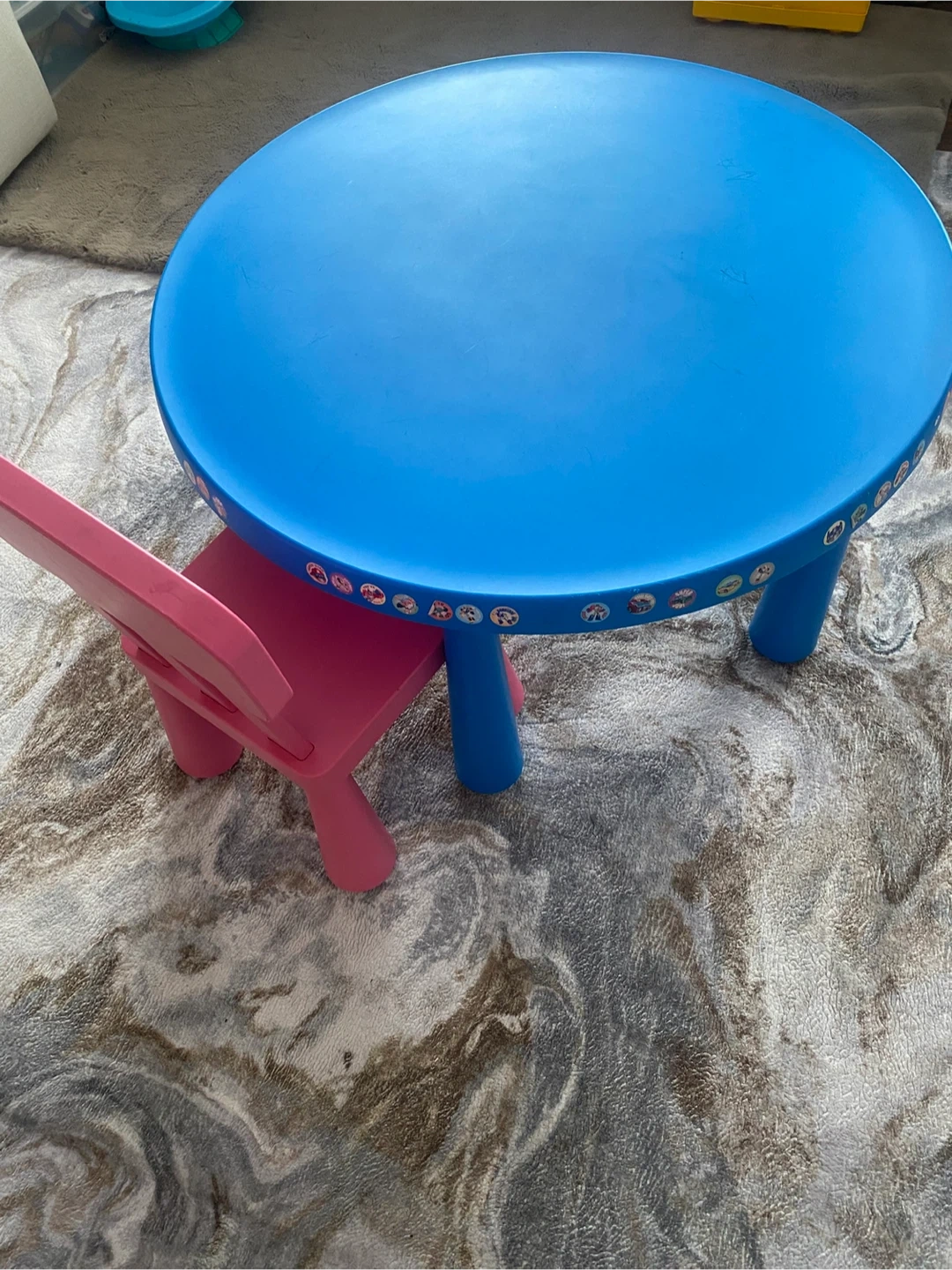 This is a blue IKEA Mammut table and a pink chair set for kids. It's made of durable plastic and perfect for playtime or crafts. The table has colourful stickers around the edge.