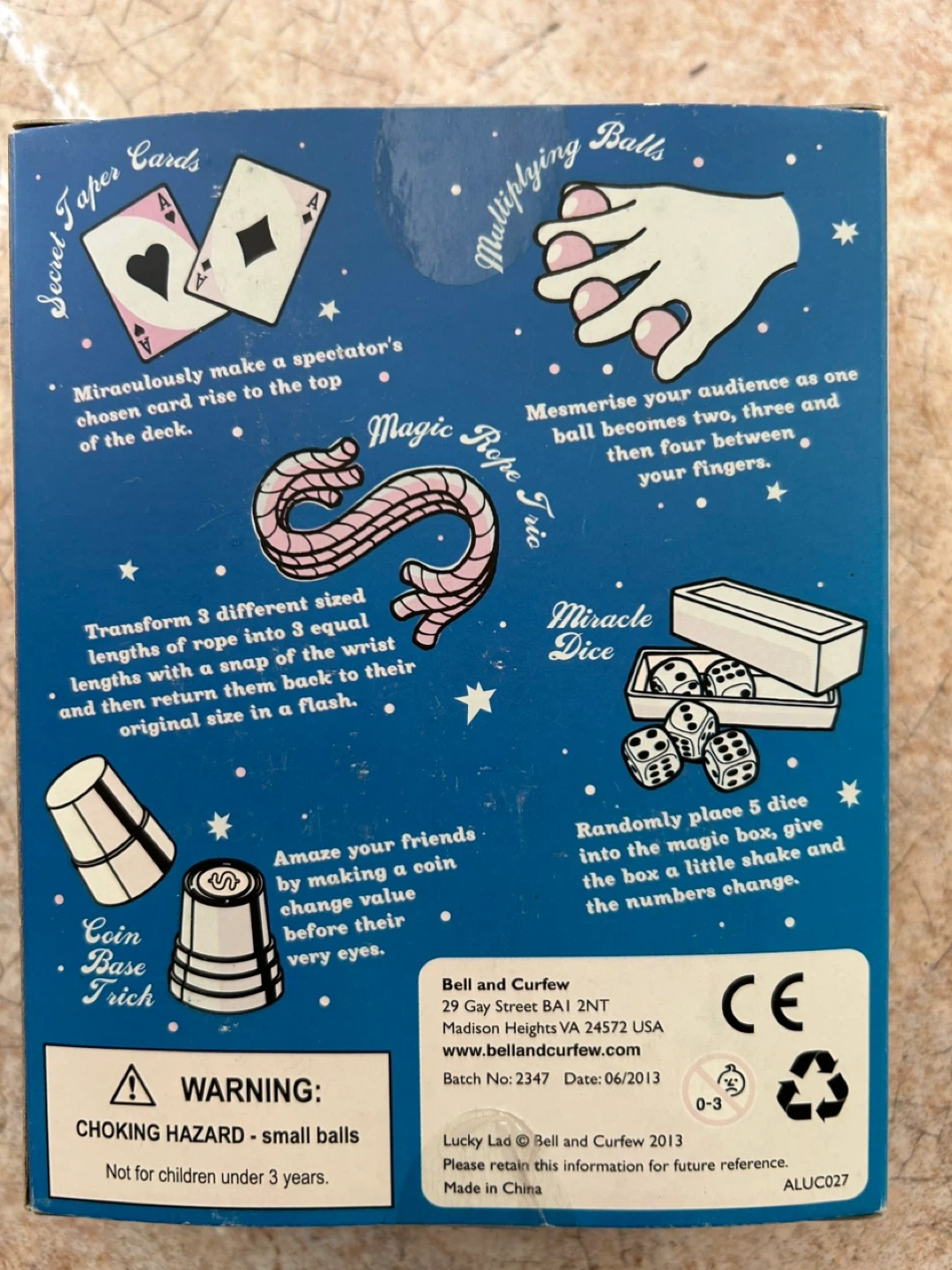 This magic kit includes five amazing tricks: secret taper cards, multiplying balls, magic rope trick, miracle dice, and coin base trick. It's suitable for ages 6 and up. Warning: choking hazard - small balls, not for children under 3 years.