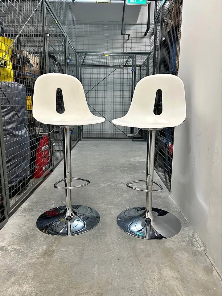Work perfect, comfortable, rotating, adjustable height and very sturdy. We have loved them, but selling because of moving and can’t take them with us. Reduced price because one has a blunt chip on the edge of the stool (pictured) and one has a slight blunt chip at the top of the other (pictured), just from general wear and tear. Pick up in Brentwood.