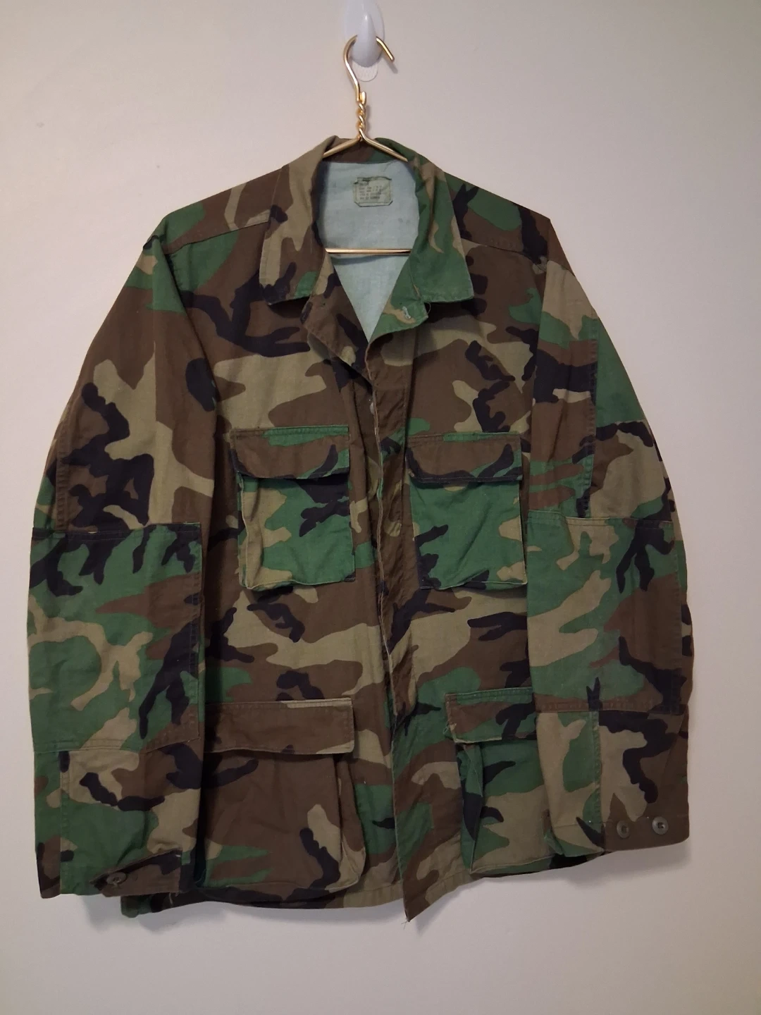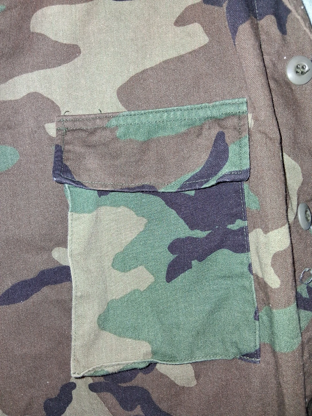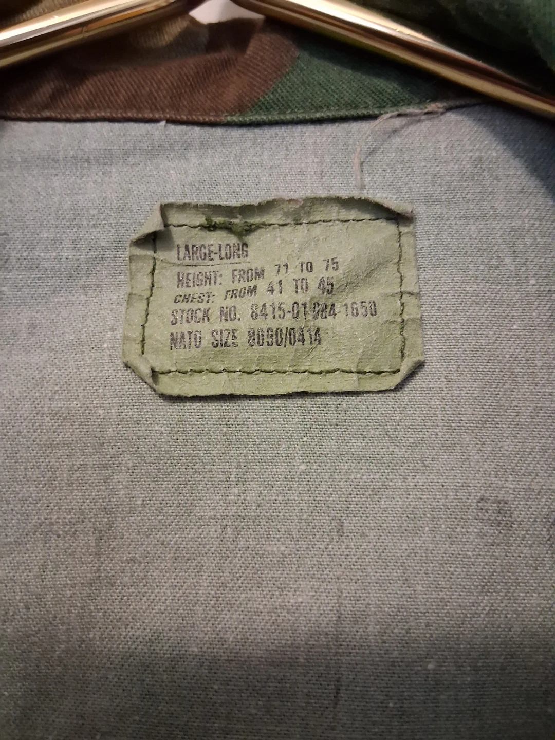 This is a Woodland camouflage combat coat. It's made of 50% cotton and 50% nylon. The size is Large-Long, with a height from 71 to 75 inches and chest from 41 to 45 inches. NATO size is 8090/0414.