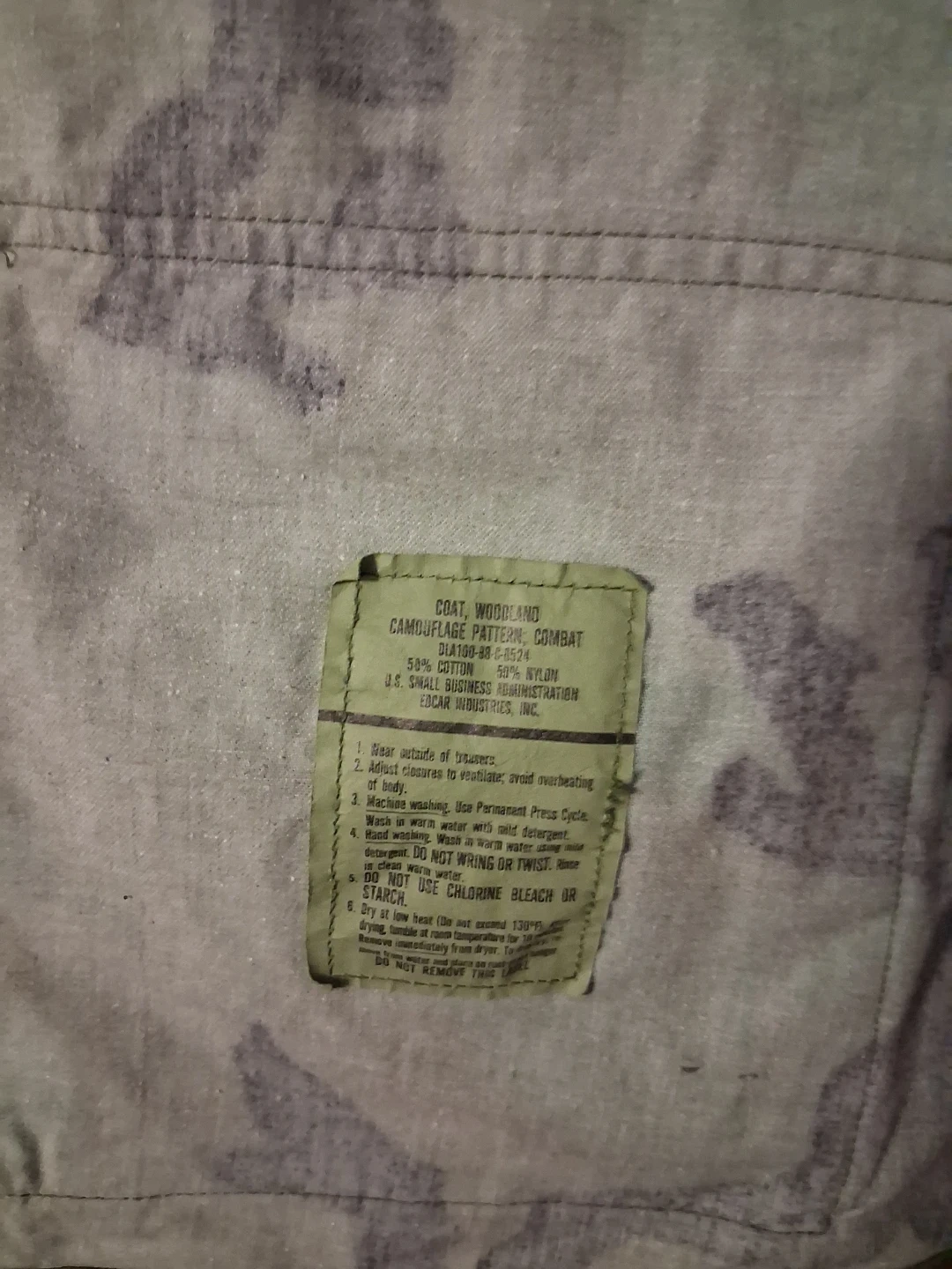 This is a Woodland camouflage combat coat. It's made of 50% cotton and 50% nylon. The size is Large-Long, with a height from 71 to 75 inches and chest from 41 to 45 inches. NATO size is 8090/0414.