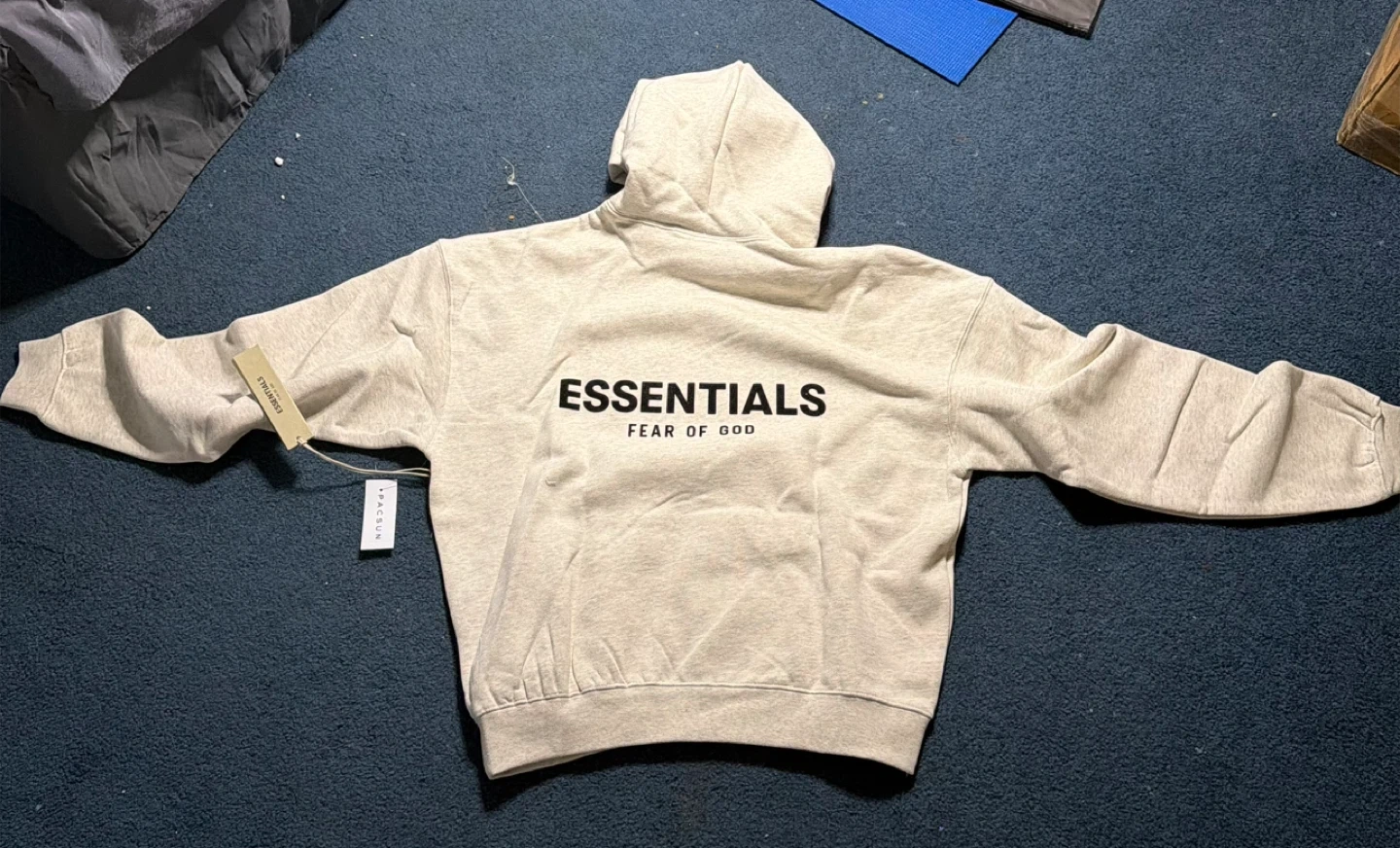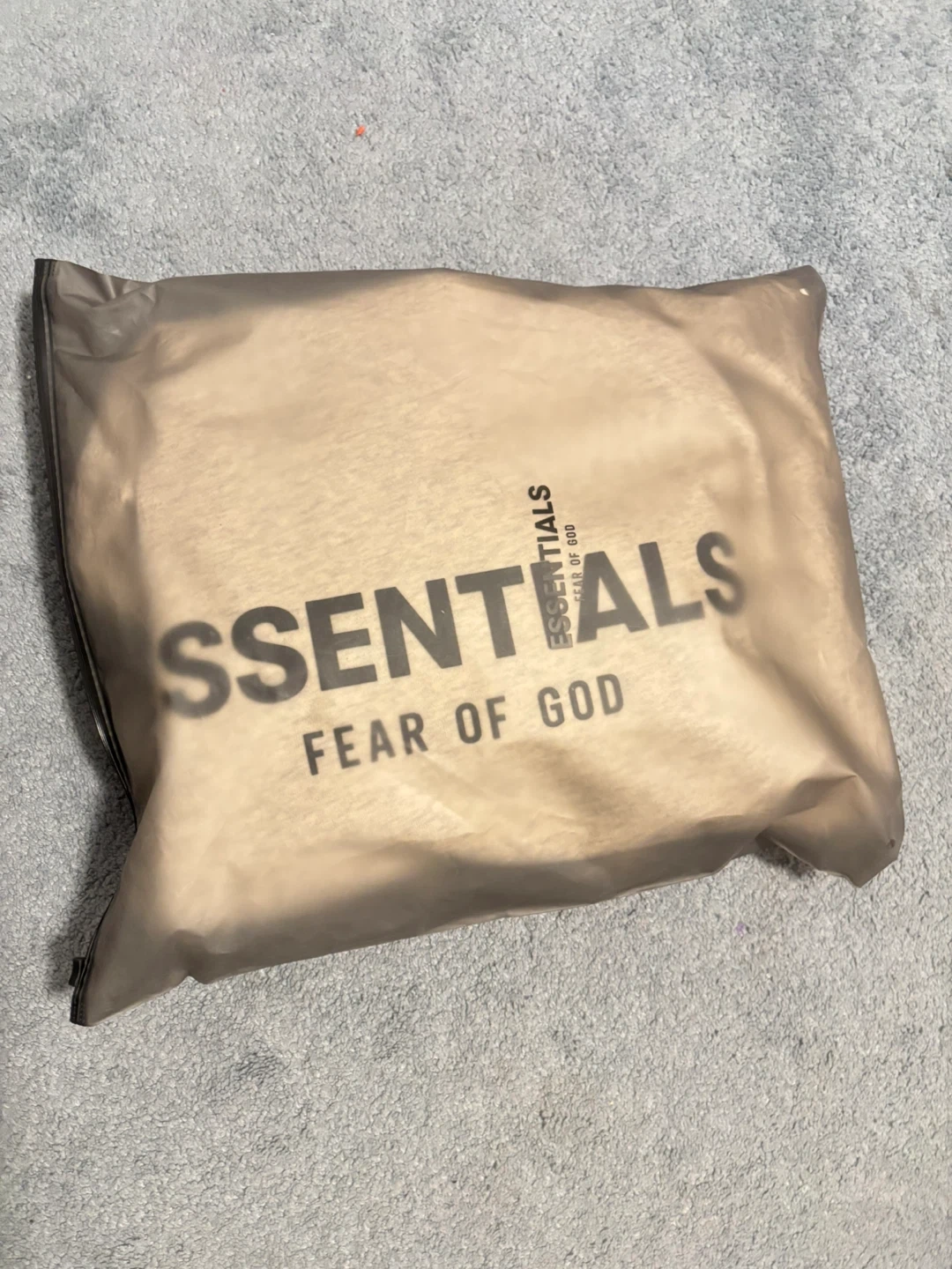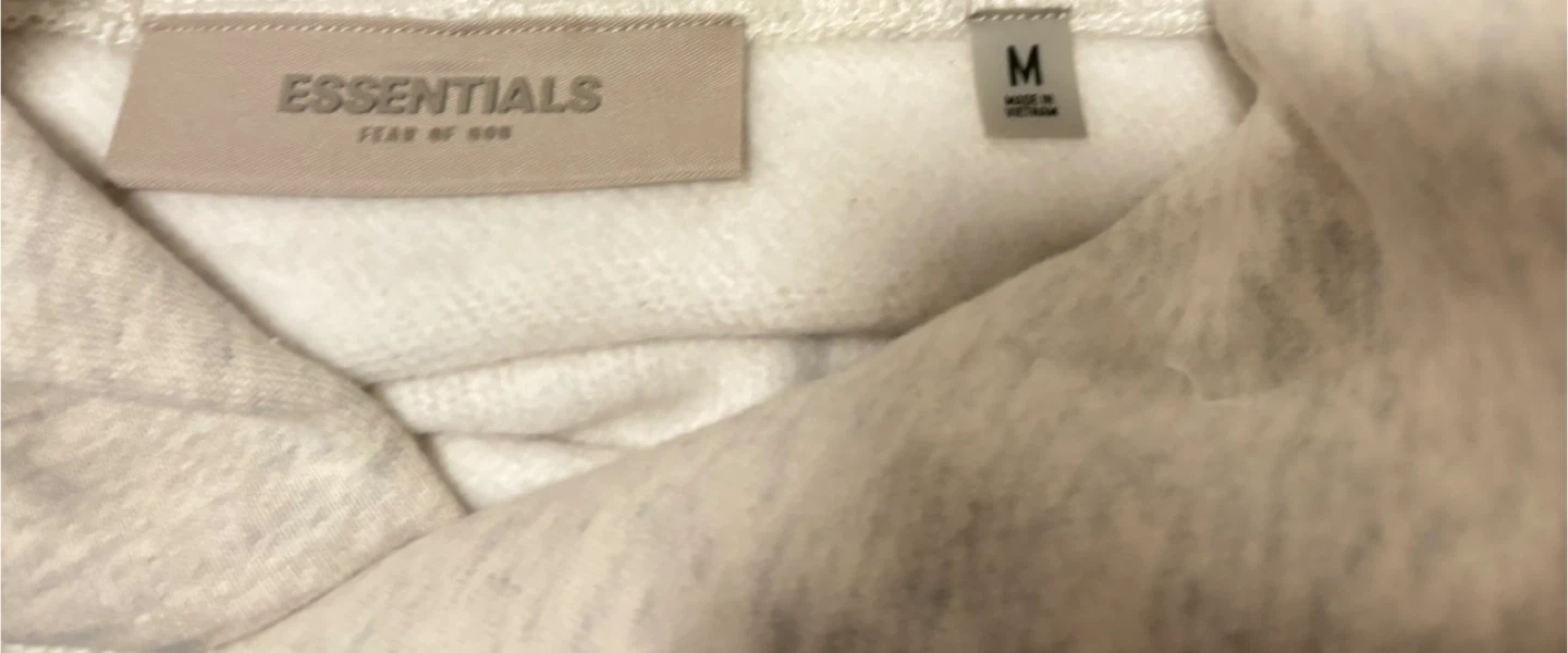 This is an ESSENTIALS Fear of God hoodie in a light grey heather colour. It's a men's size medium and comes with the original tags and packaging. Cotton blend material.