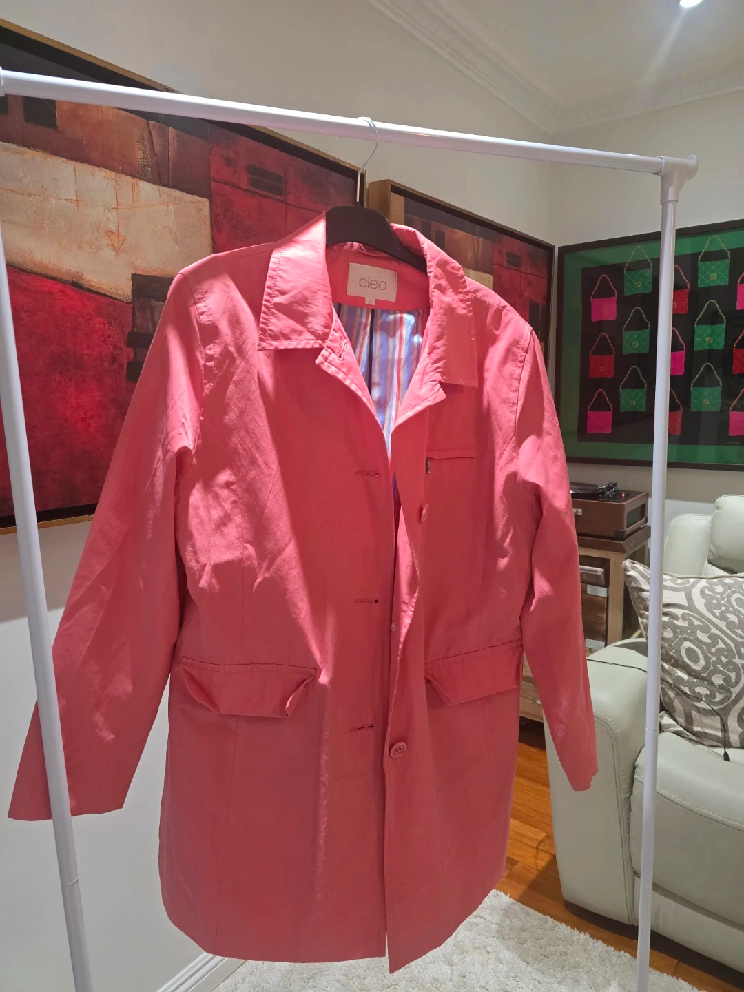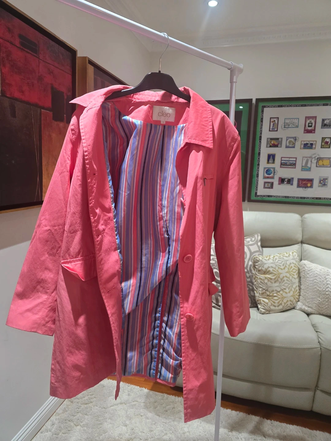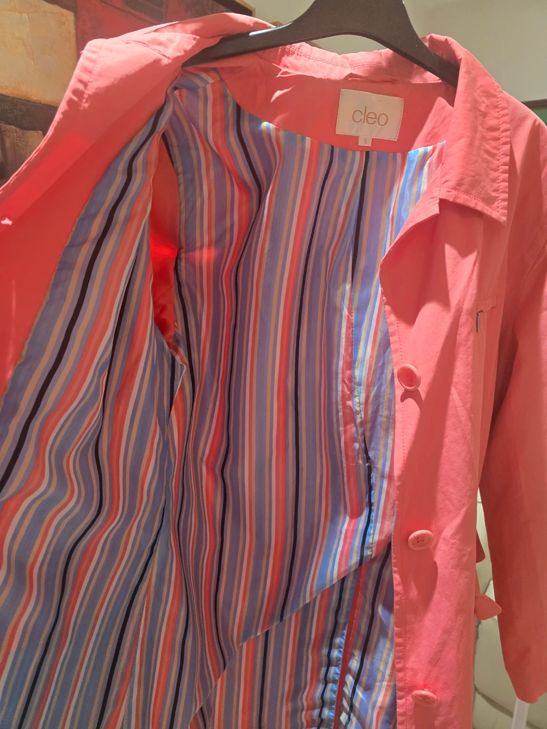 A stylish pink trench coat by Cleo, perfect for layering. It features a vibrant striped lining for a pop of colour. This jacket has two front pockets and button closure. It's a great outerwear piece for transitional weather!