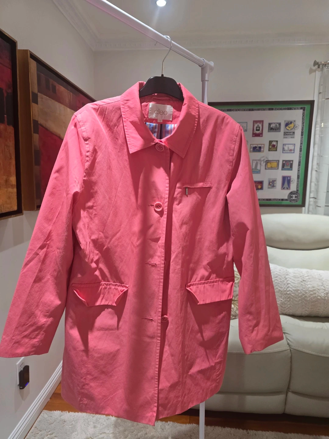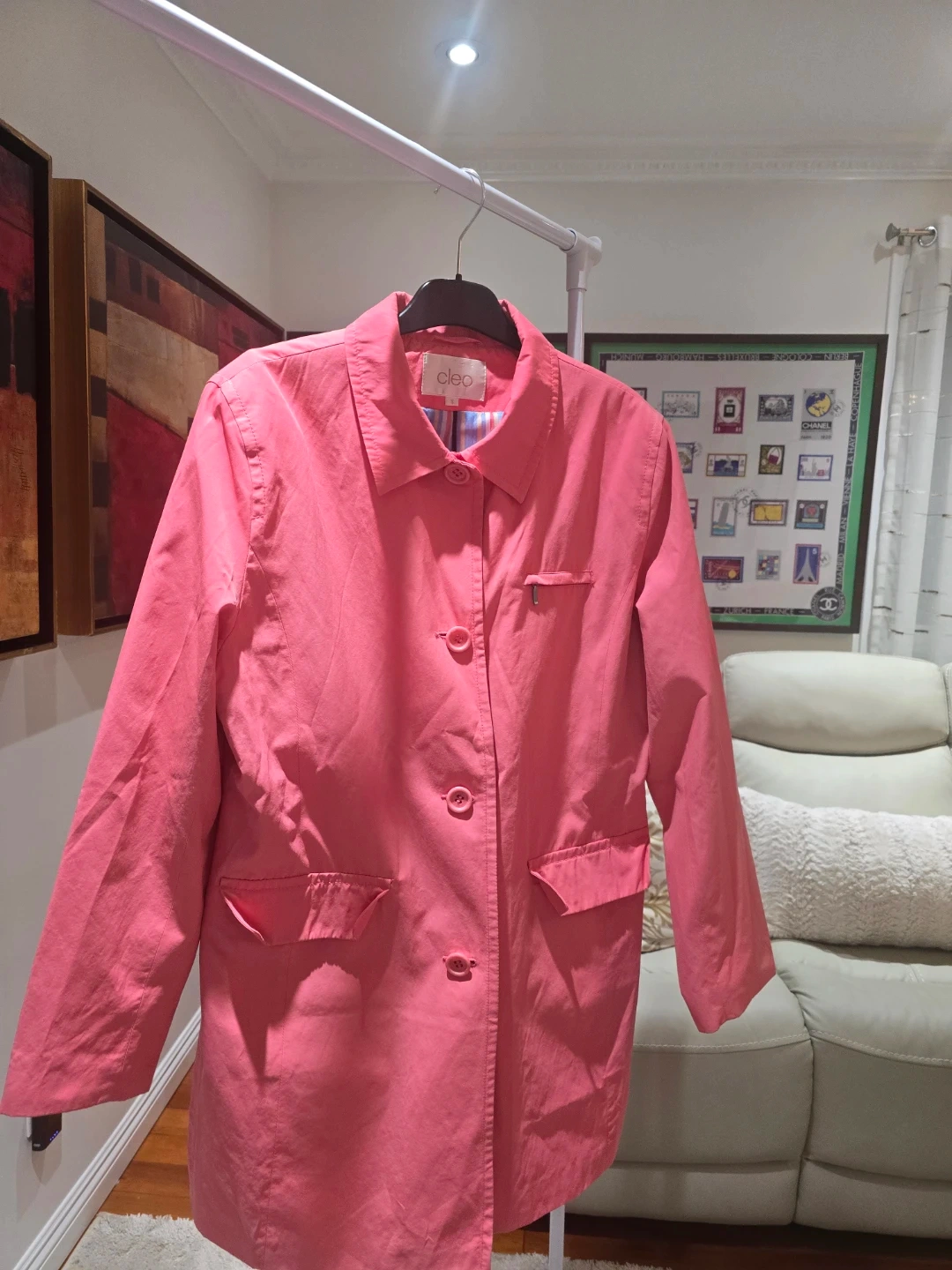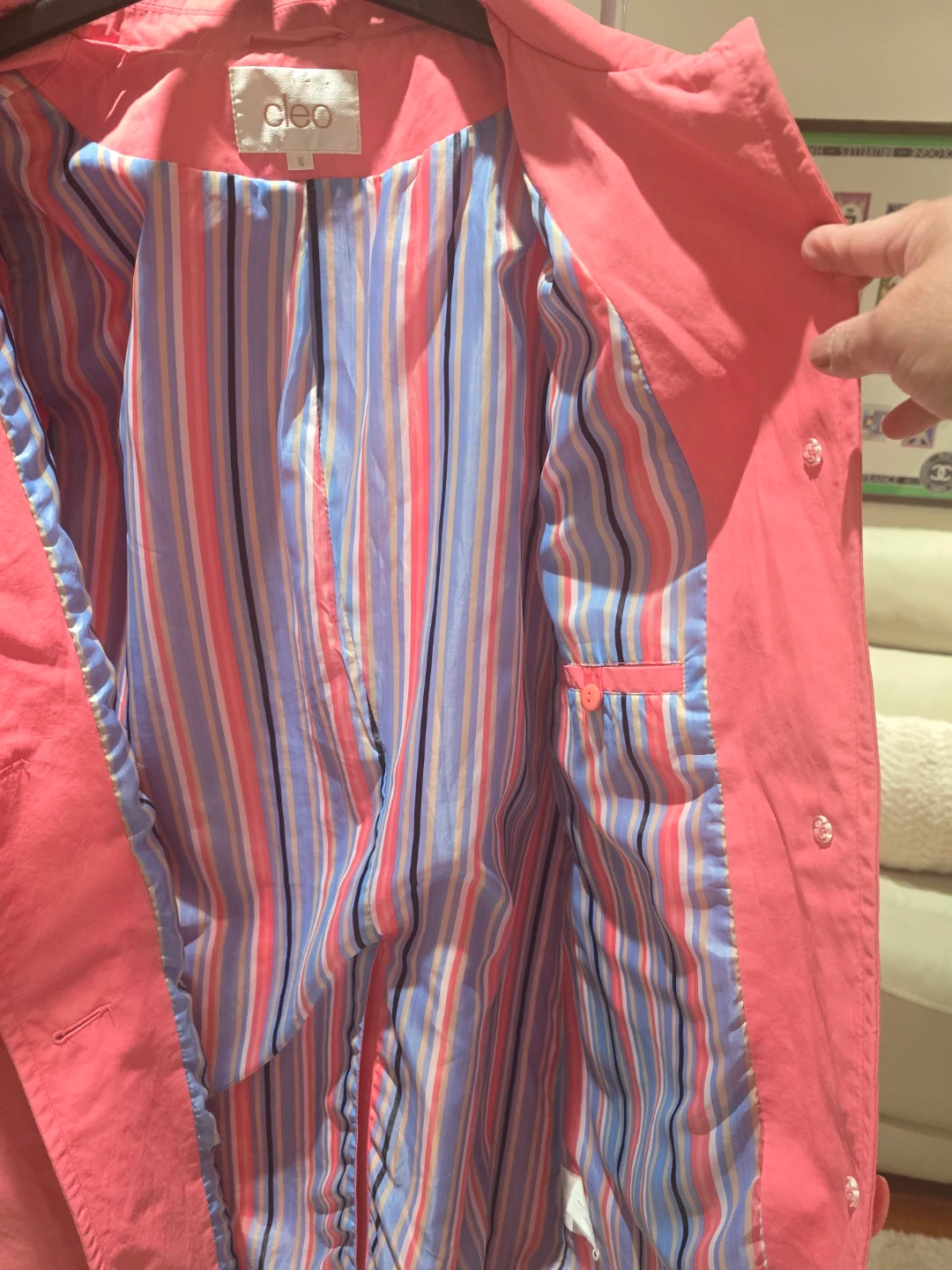 A stylish pink trench coat by Cleo, perfect for layering. It features a vibrant striped lining for a pop of colour. This jacket has two front pockets and button closure. It's a great outerwear piece for transitional weather!