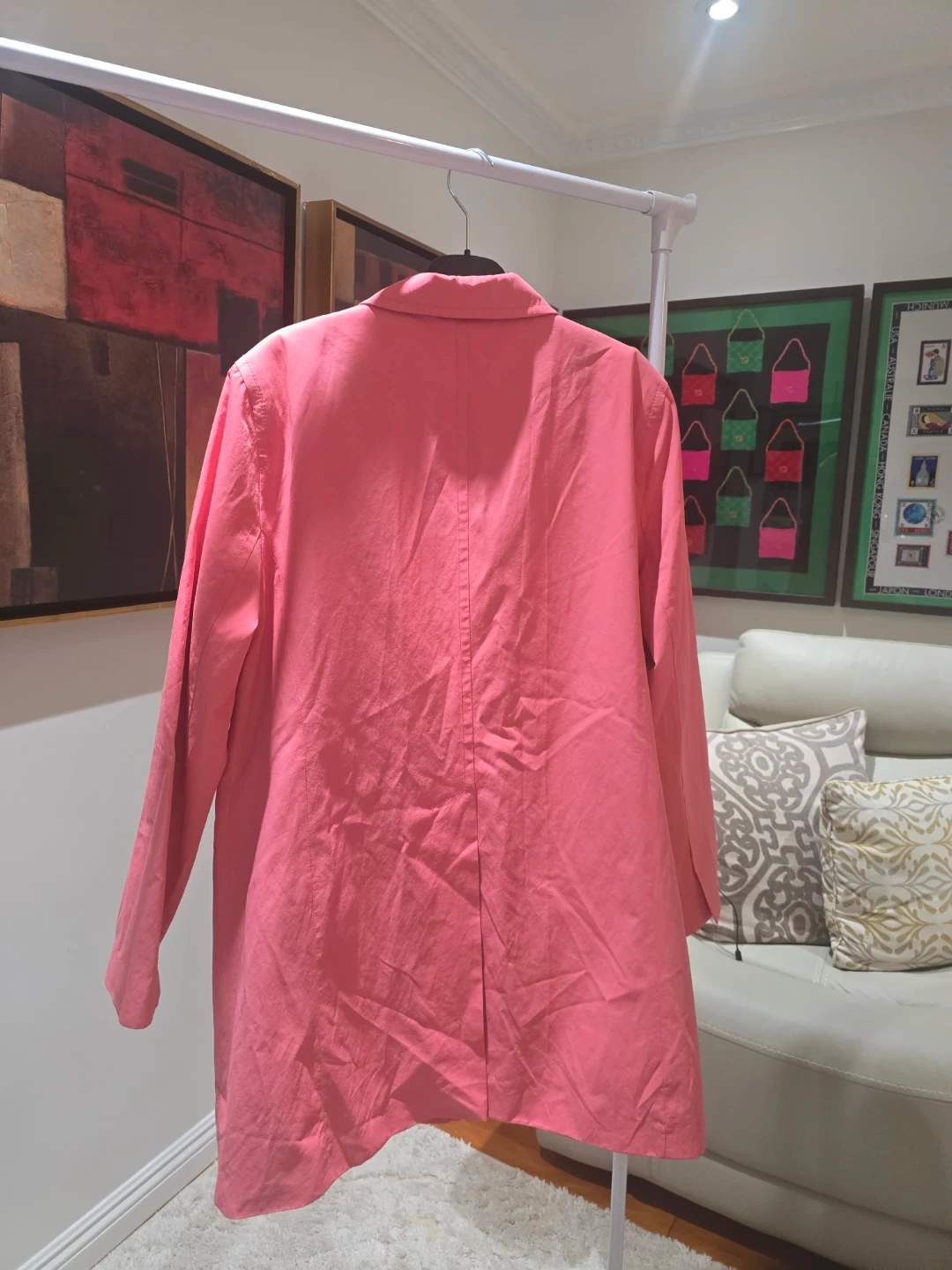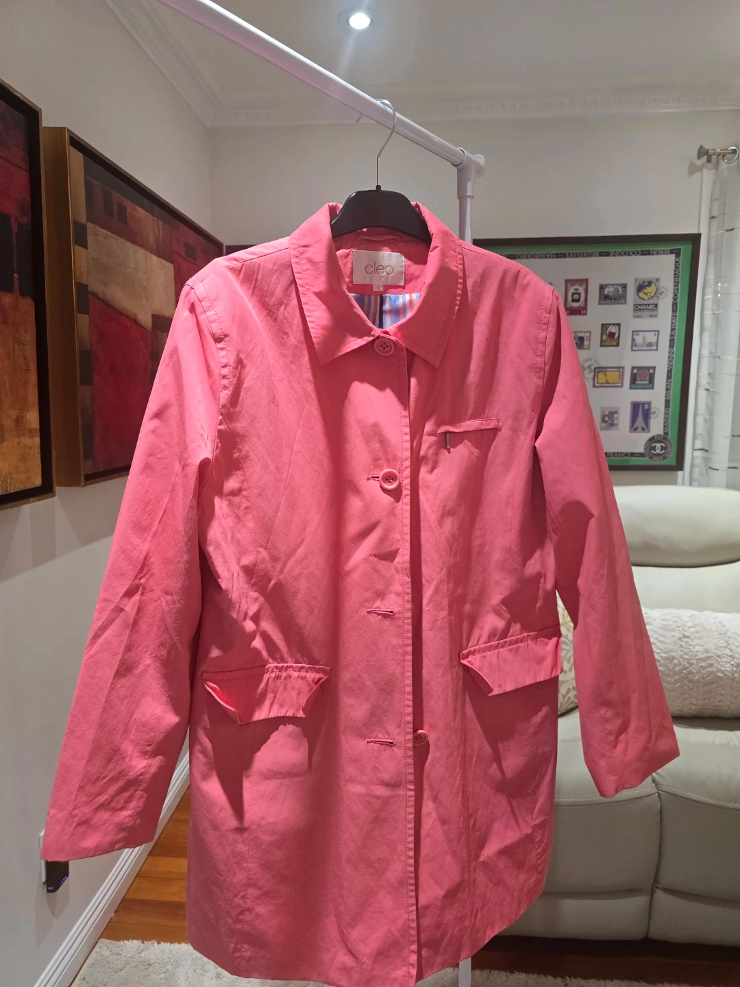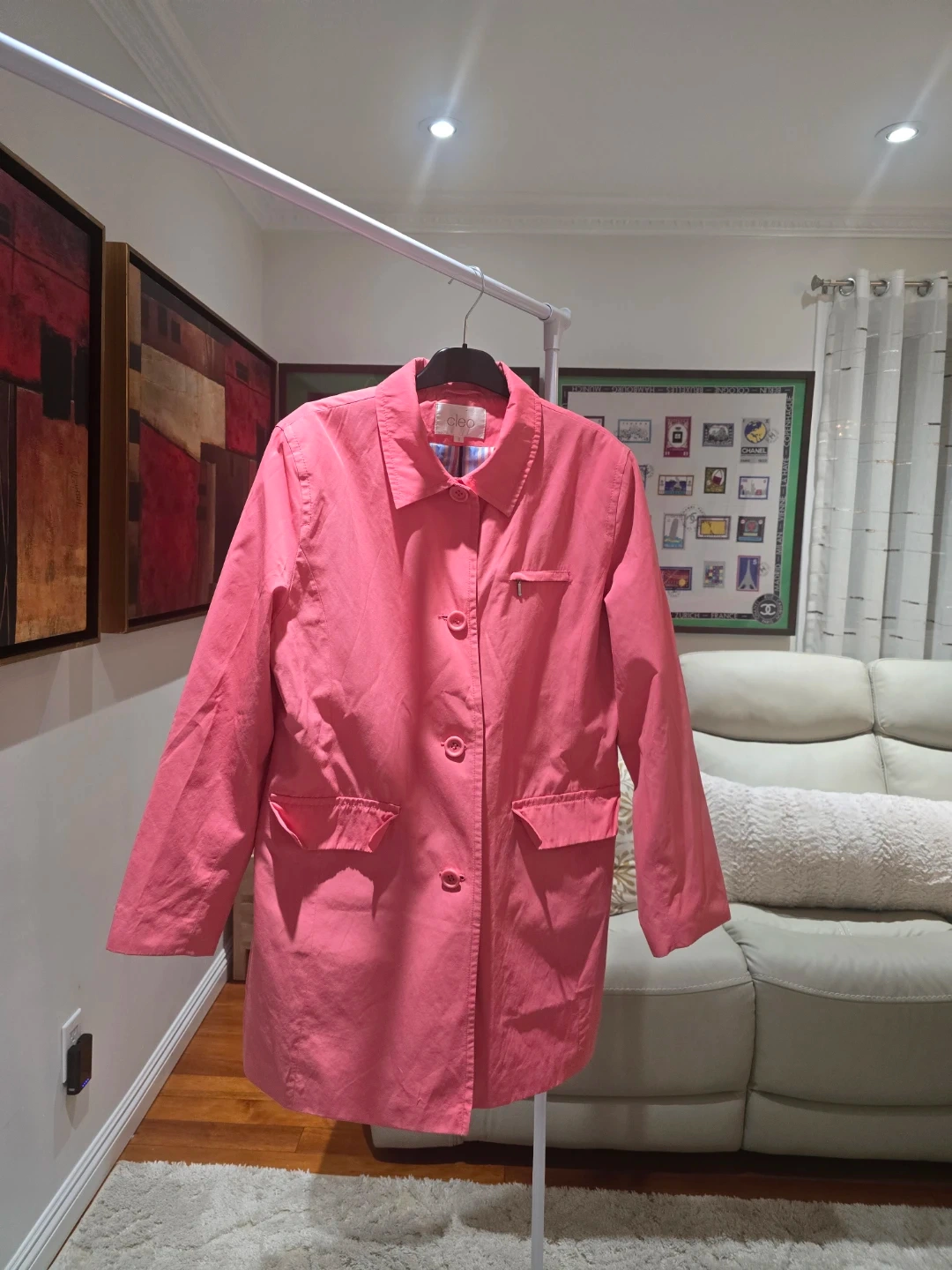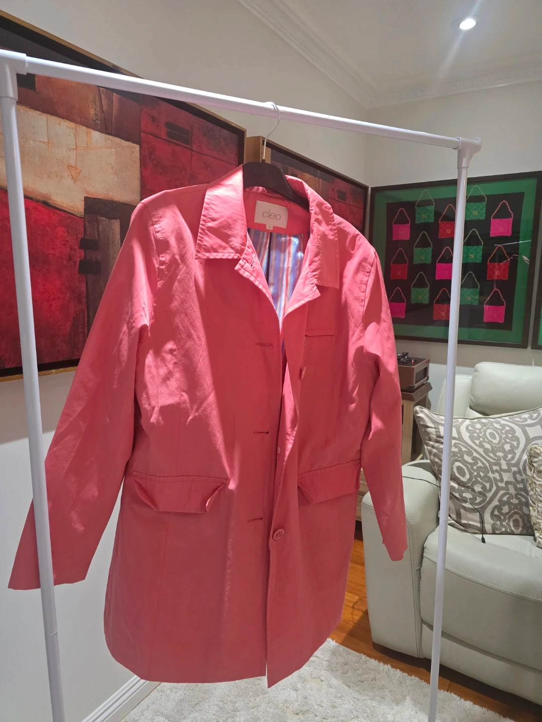 A stylish pink trench coat by Cleo, perfect for layering. It features a vibrant striped lining for a pop of colour. This jacket has two front pockets and button closure. It's a great outerwear piece for transitional weather!