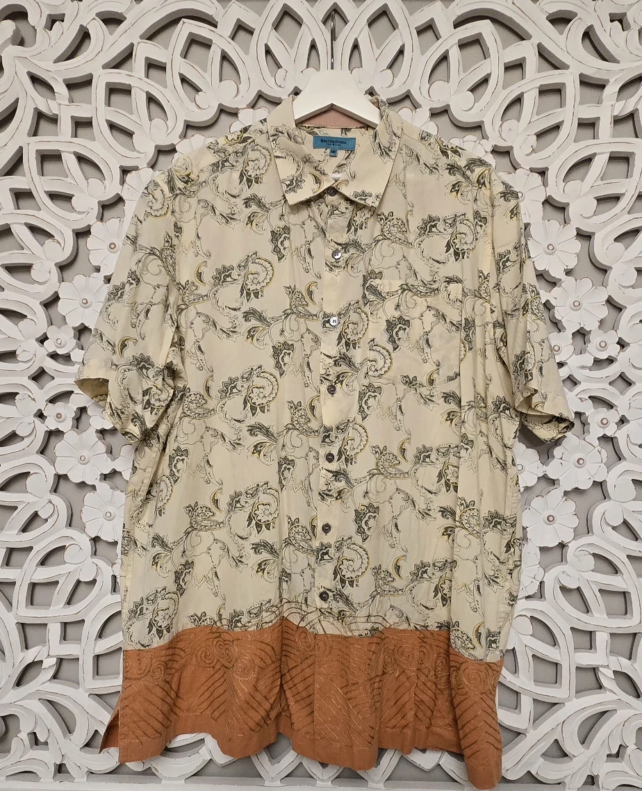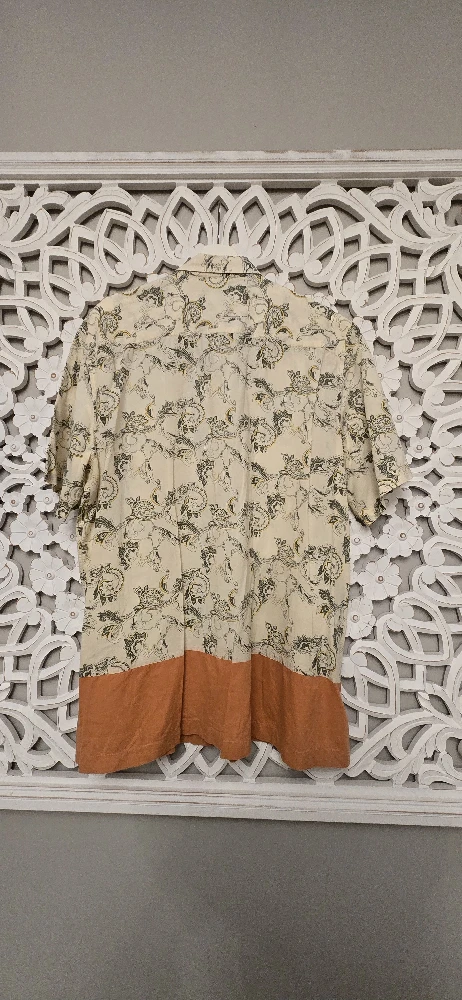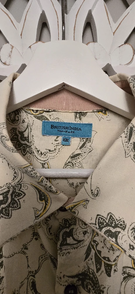 Selling a British India Traveller shirt in size XXL. The shirt features a unique floral pattern and a contrasting panel at the bottom. It's in great condition and ready for a new home!