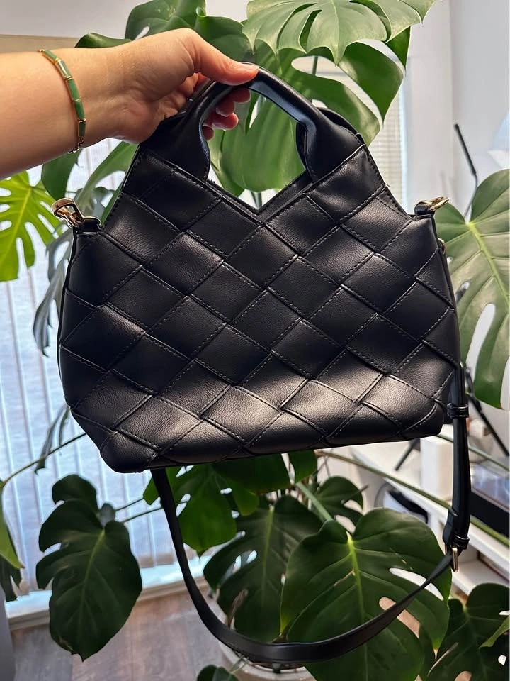 Stylish black woven handbag with top handles and a detachable, adjustable shoulder strap. Comes with original LUXE dust bag. Measures about 11 inches wide. Great for everyday or going out. Brand new!