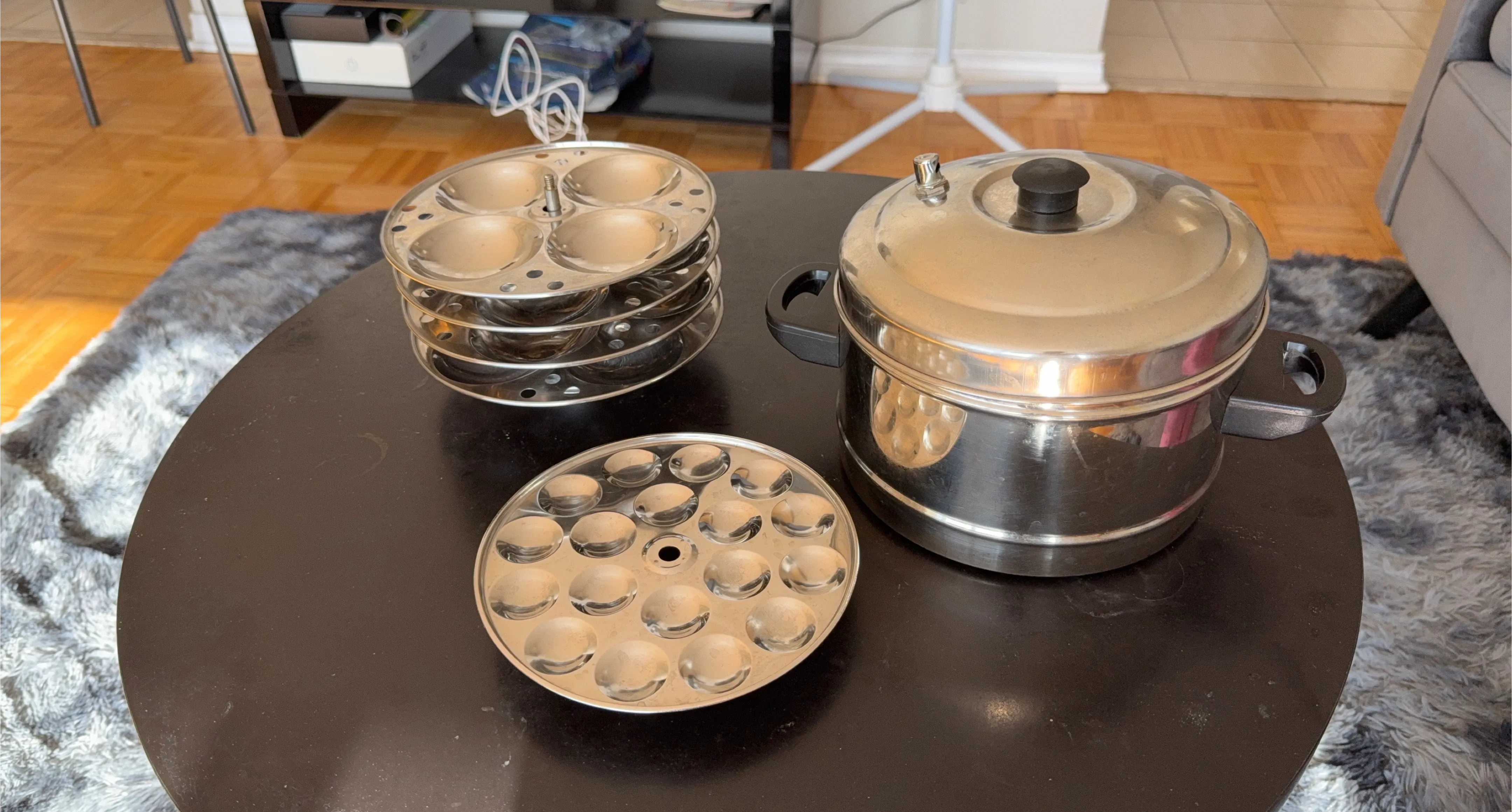 This is a stainless steel idli maker set. It comes with a pot and three stackable idli plates. The pot has a lid with a handle and a vent. This set is great for making idlis at home!