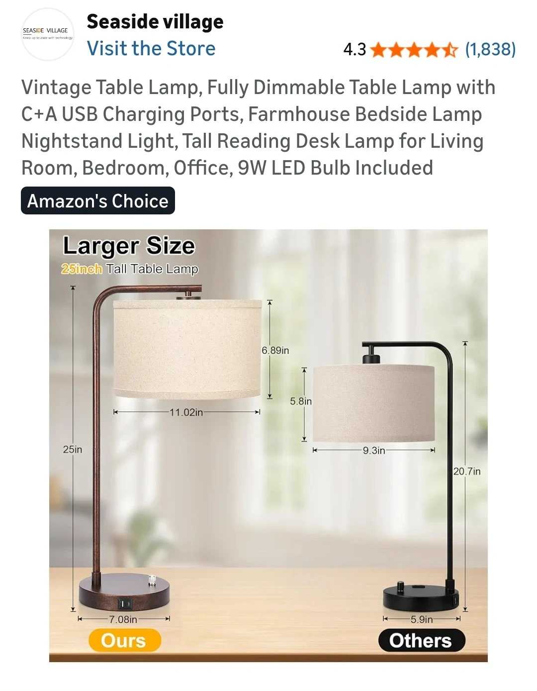Vintage Table Lamp, Fully Dimmable Table Lamp with C+A USB Charging Ports, Farmhouse Bedside Lamp Nightstand Light, Tall Reading Desk Lamp for Living Room, Bedroom, Office, 9W LED Bulb Included