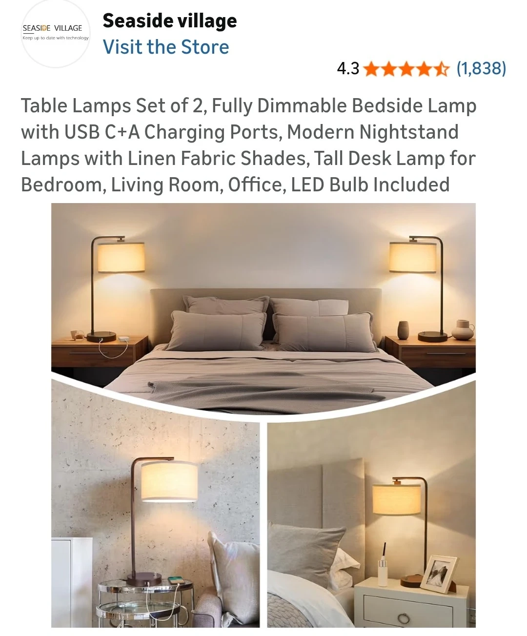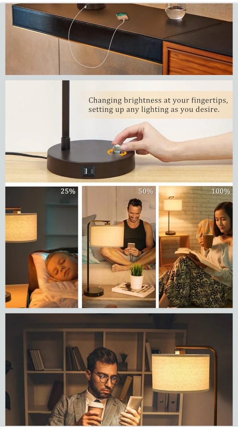 Set of 2 Fully Dimmable Bedside Table Lamps with USB Ports