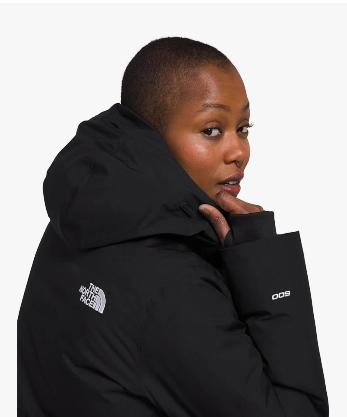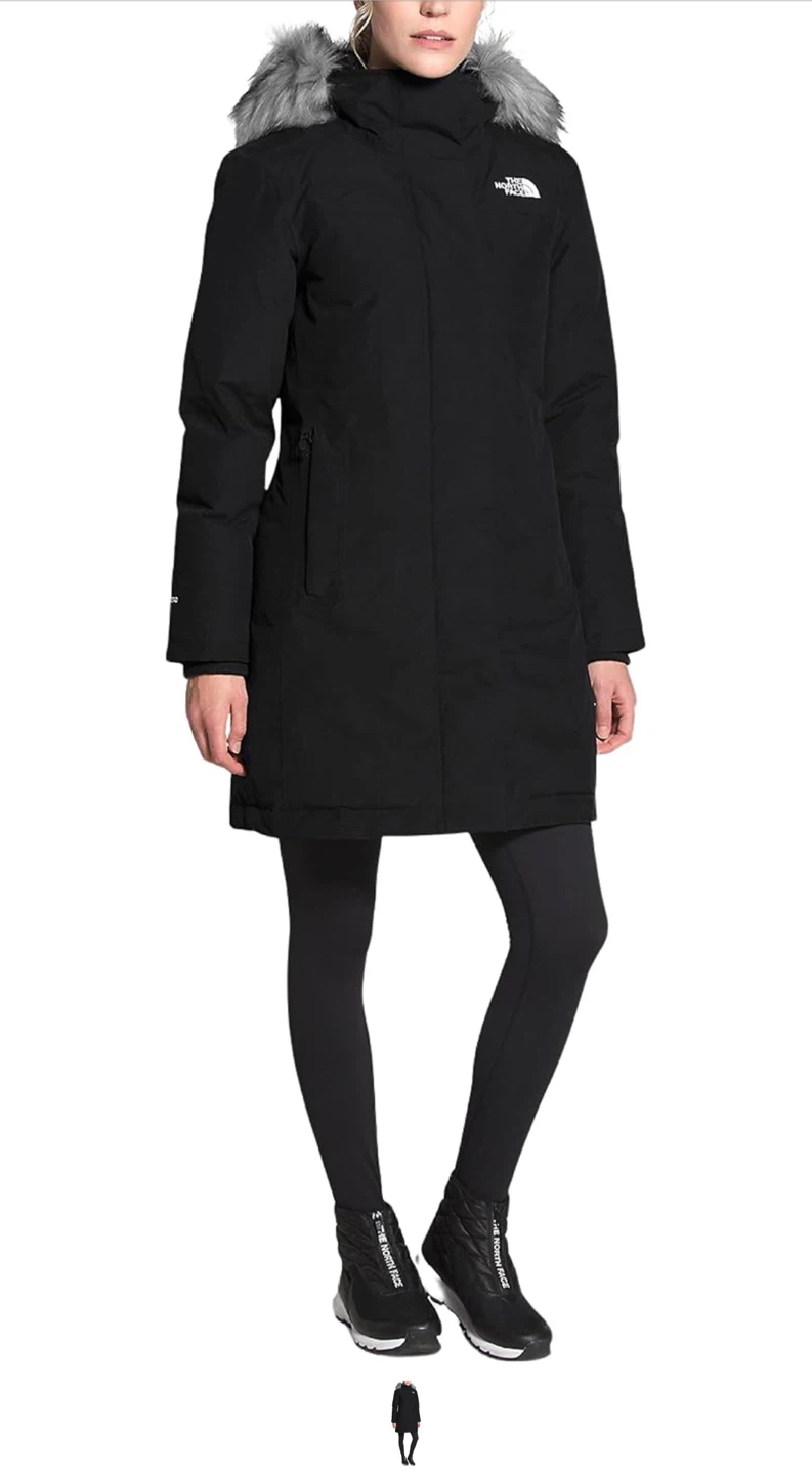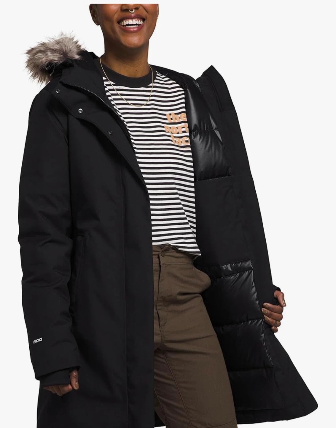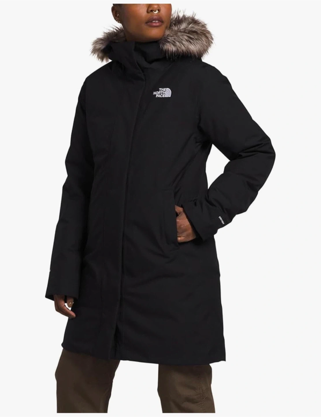 This black parka from The North Face offers excellent warmth and style. It features a full zip closure, adjustable waist drawcords, and a cozy faux fur-lined hood. It's great for staying comfortable during colder months!