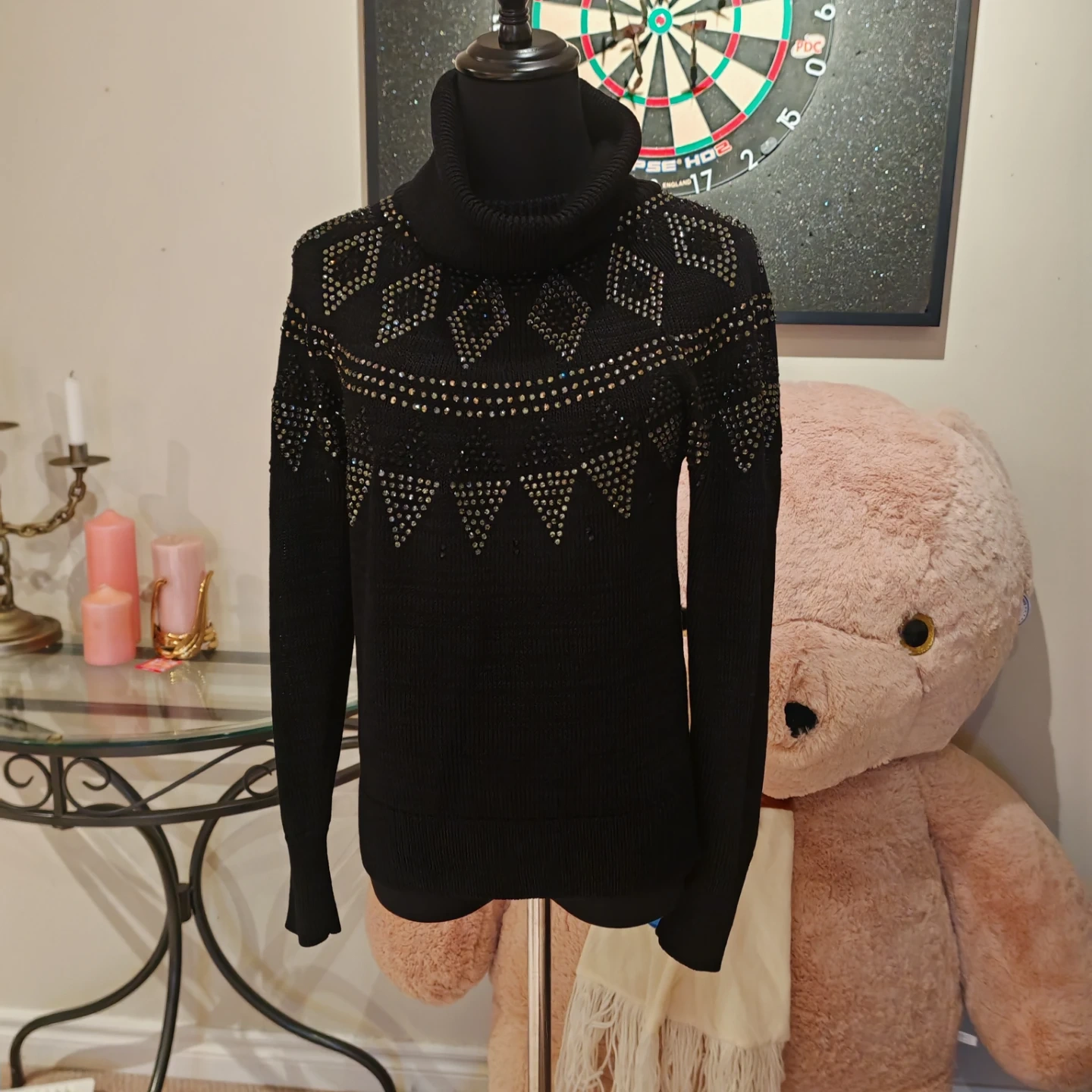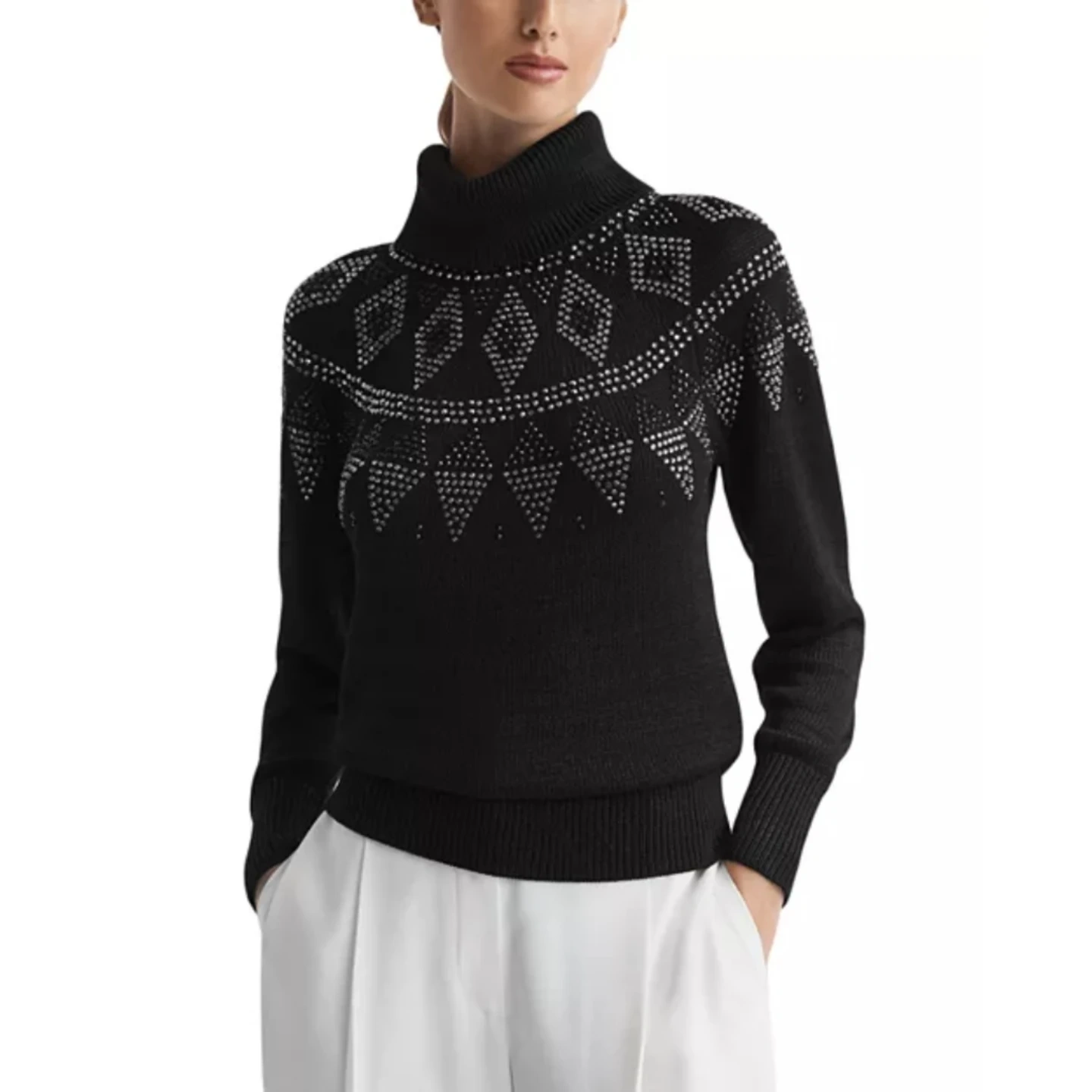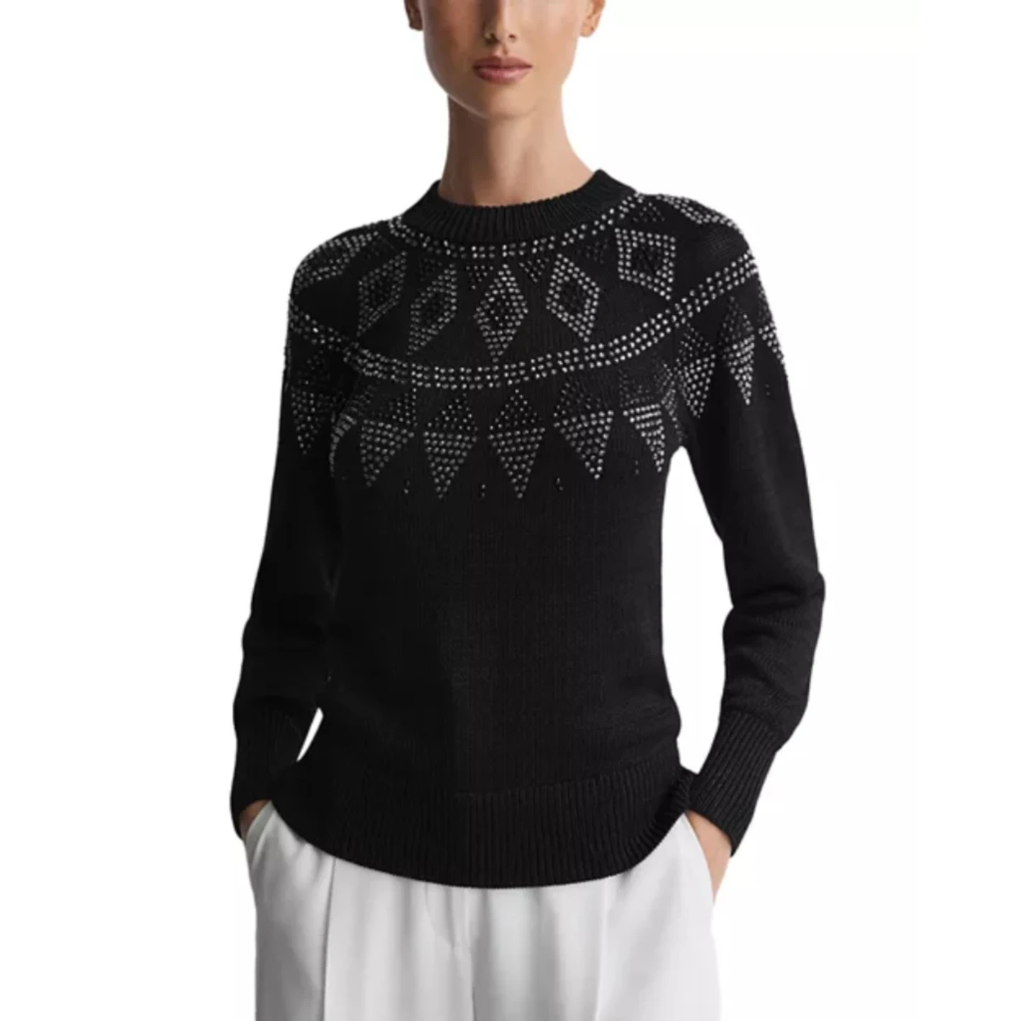 Add some sparkle to your wardrobe with this REISS Bella embellished sweater! This stunning, black sweater features dazzling embellishments. It is in good condition, ready to elevate your style.