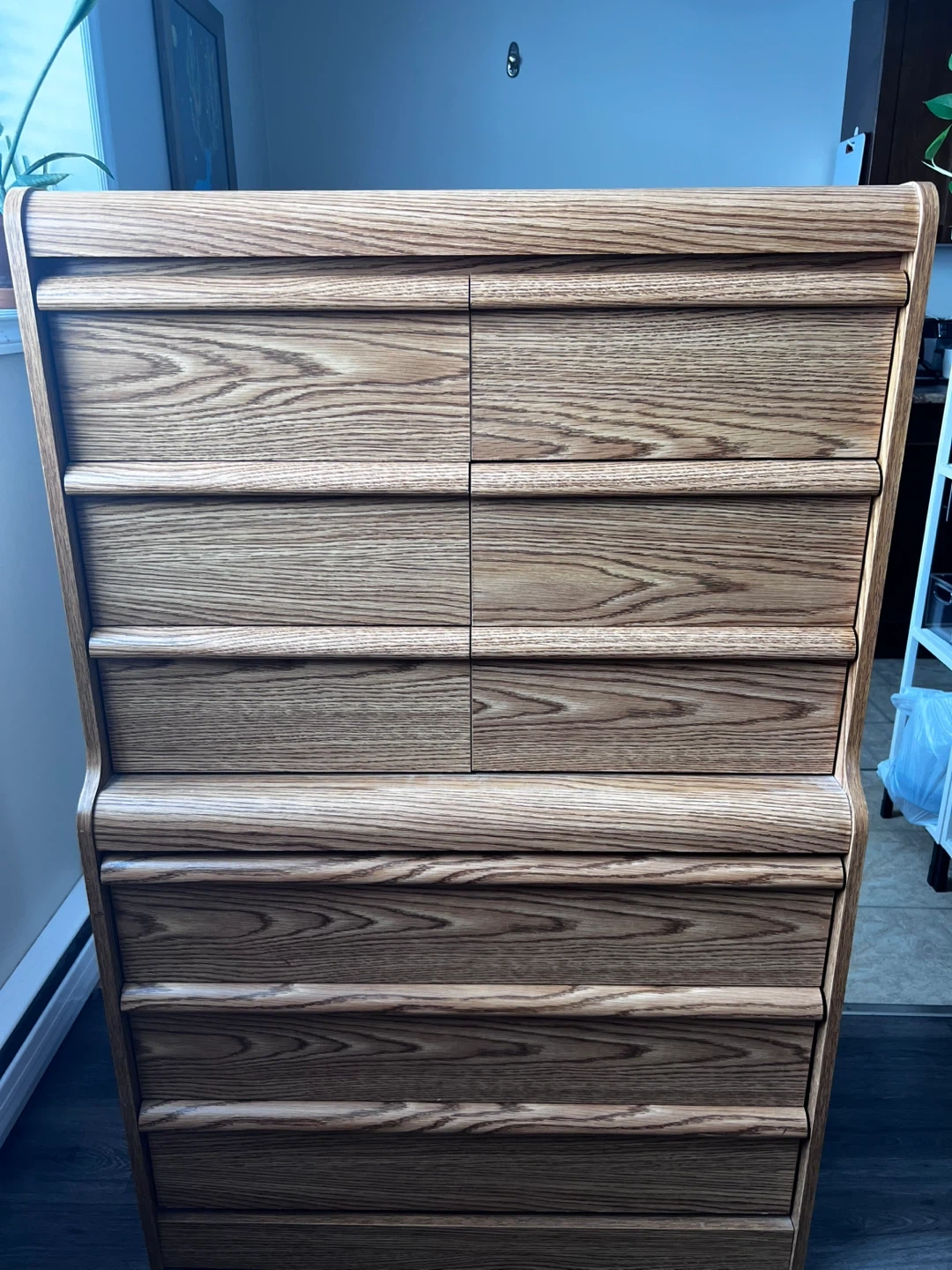 A piece of iconic design. This golden oak dresser features a striking waterfall silhouette and built-in sculpted handles for a clean, architectural look.