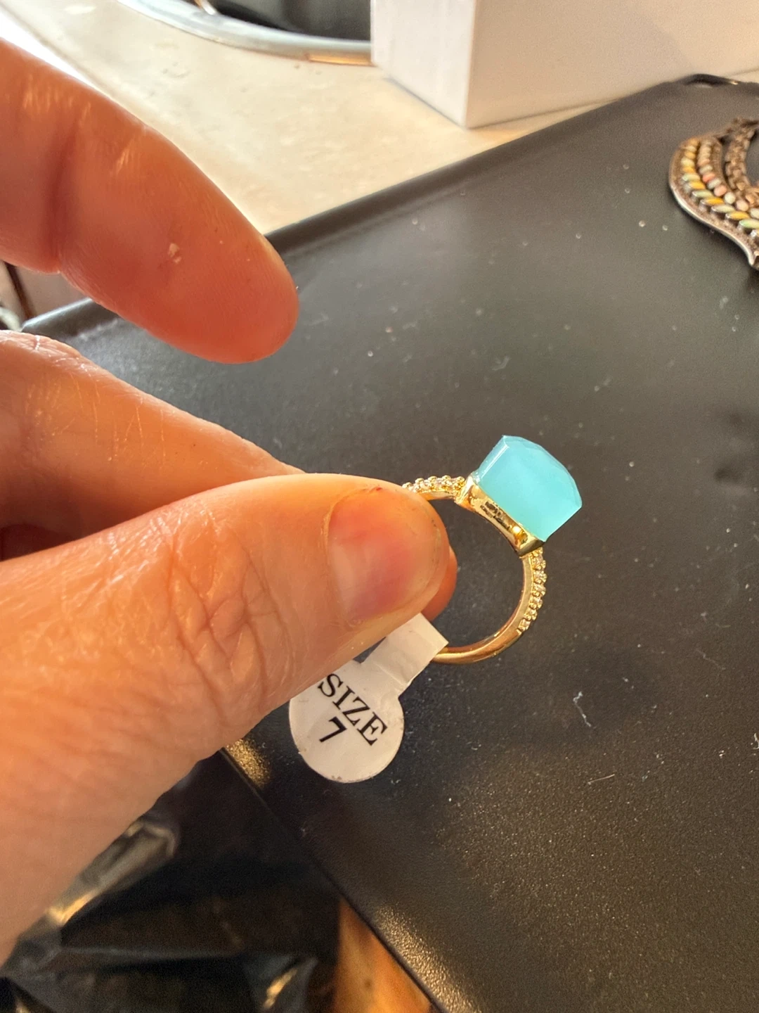 Ring with a blue stone and small accent stones on the band. It's size 7. The band appears to be gold-toned metal.