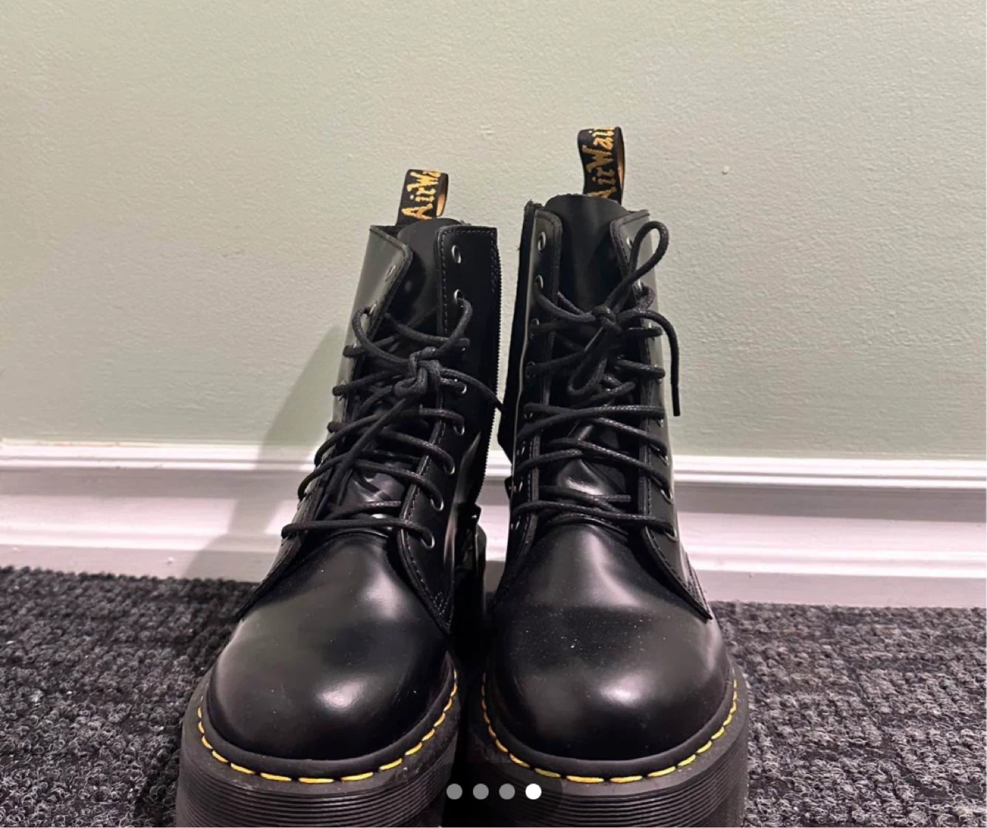 Dr. Martens JADON boots in black polished smooth leather. UK size 7 (EU 41, US Women's 9). Features the signature platform sole and yellow stitching