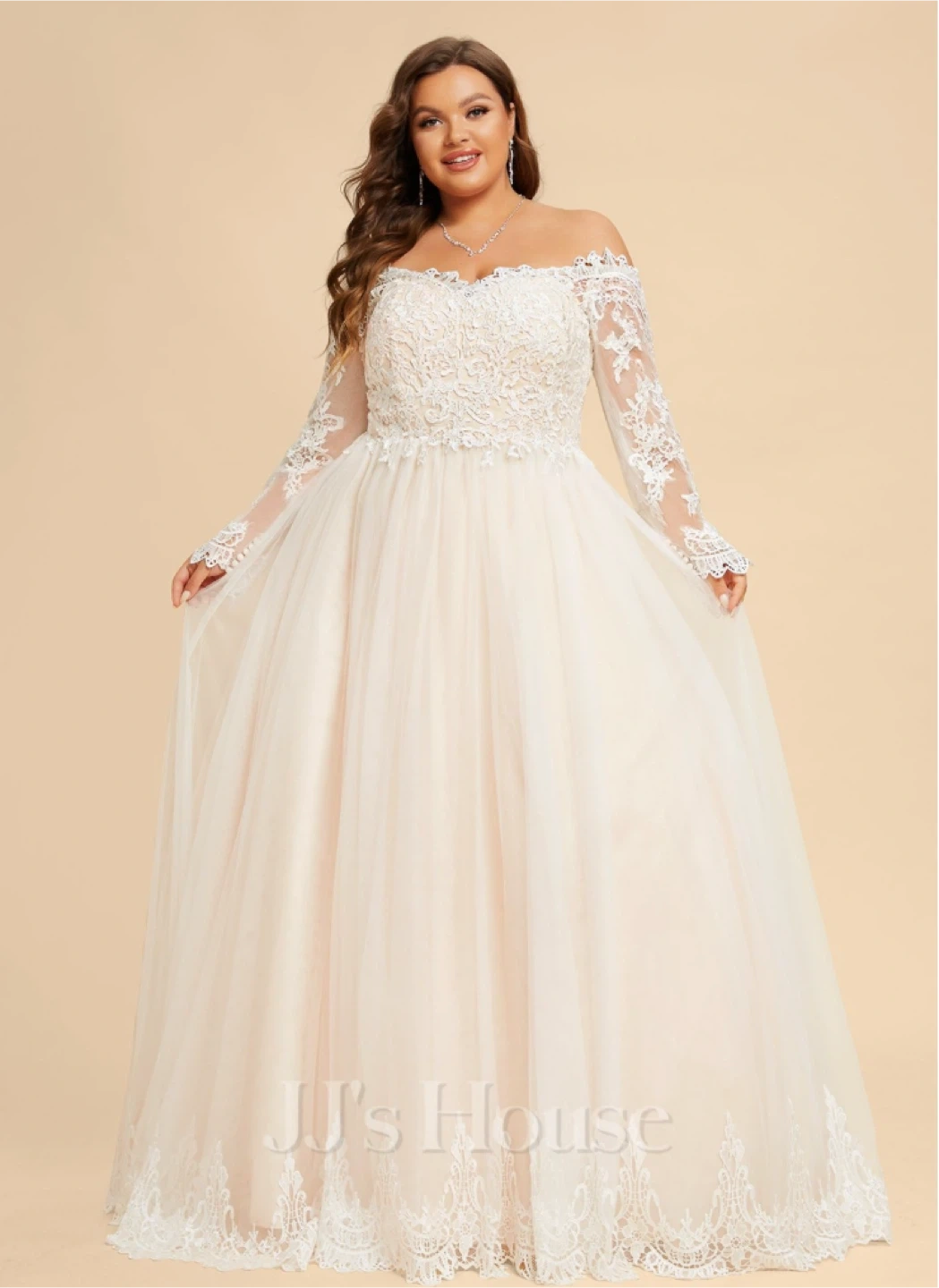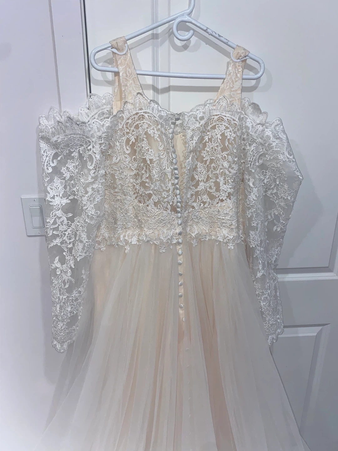 Selling a beautiful JJ's House wedding dress. It features delicate lace detailing on the bodice and sleeves, with a flowing tulle skirt. The dress has an off-the-shoulder design and button detailing down the back. It's in great condition and ready for its special day!