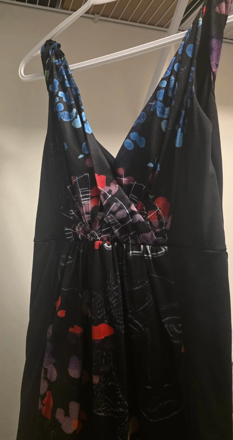 A black dress featuring a vibrant print with floral accents and a Ferris wheel design. It has a flattering V-neckline and a gathered waist. The fabric is lightweight and drapes nicely. Perfect for a night out or a special occasion!