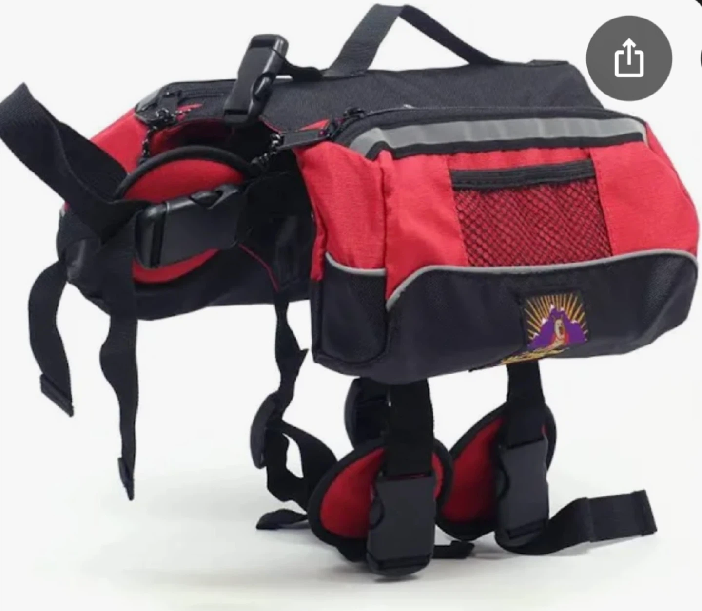 Large size; very adjustable and comfortable. This Outward Hound dog backpack is red and black. It has adjustable straps and quick-release buckles. It's designed for pet travel.