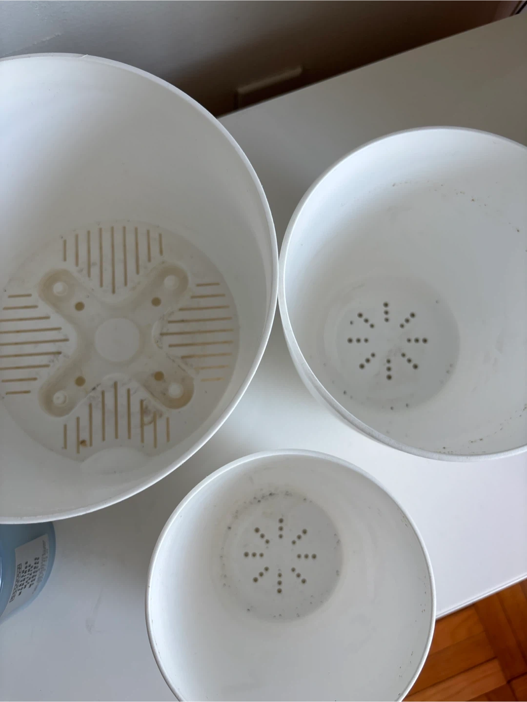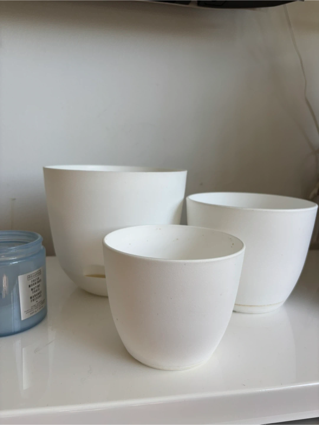 This is a set of three white plastic plant pots. They're designed for indoor use and have drainage holes. Comes with one large, one medium, and one small pot.
