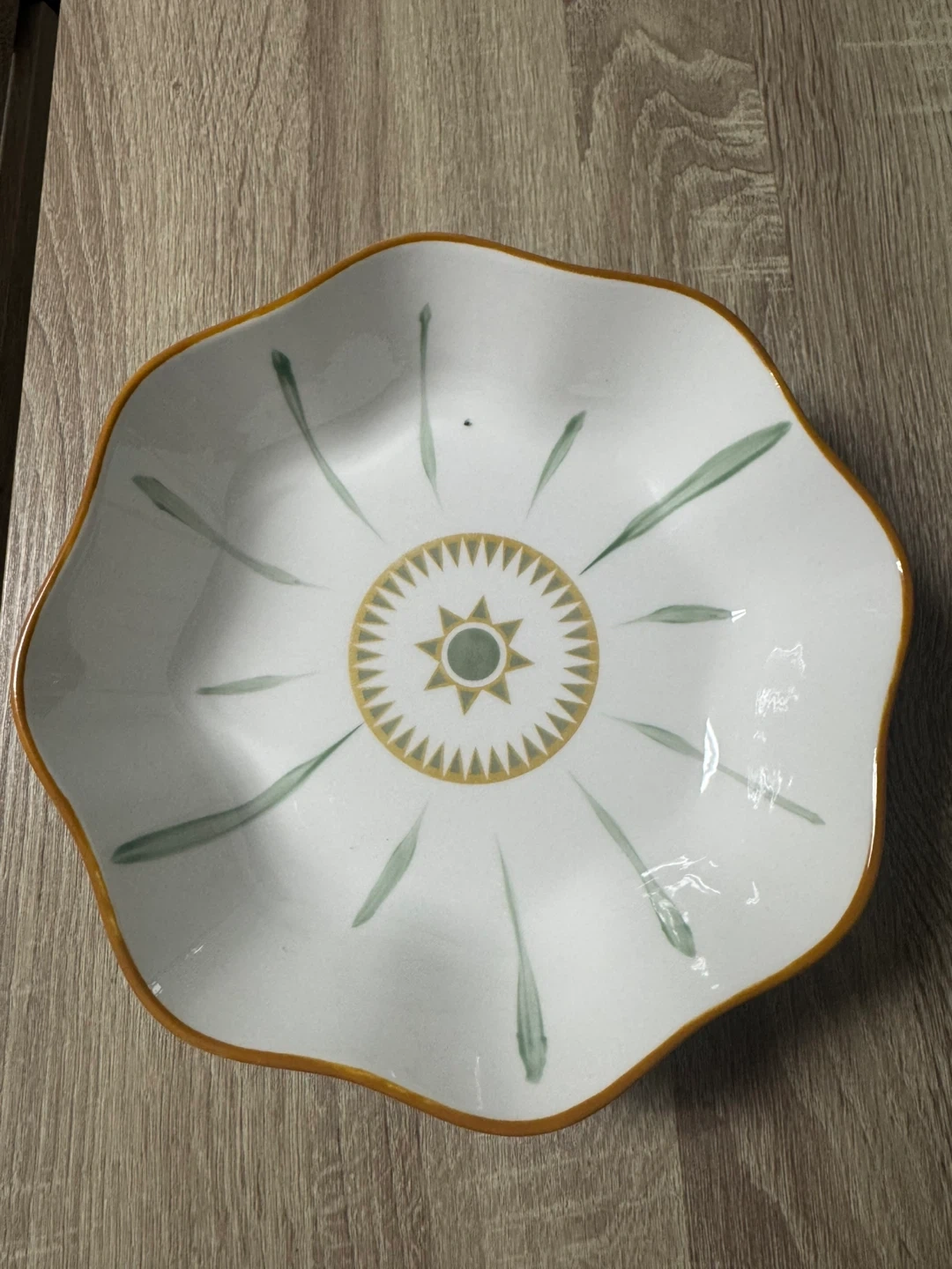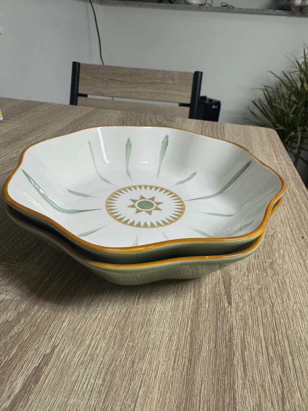 A set of two decorative ceramic bowls, featuring a floral sunburst design. These bowls have a unique scalloped edge and a green glaze on the exterior. Perfect for serving snacks or as a decorative accent piece.