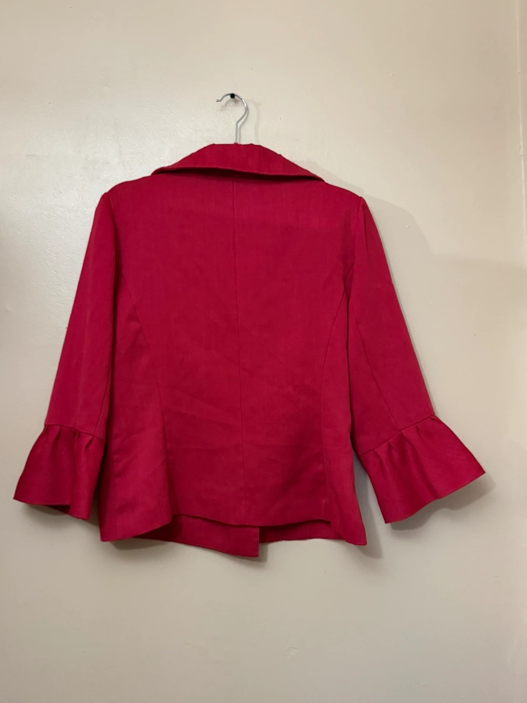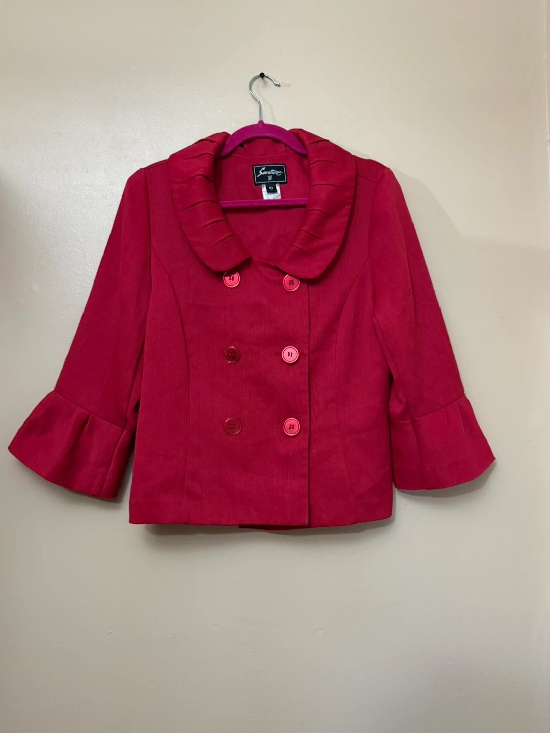 This is an elegant red blazer in size 10, featuring a double-breasted button closure and stylish bell sleeves. The blazer is in good condition, showing gentle signs of wear.