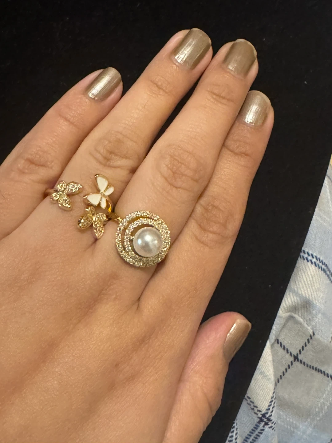 A beautiful set of two gold-tone rings. One features a pearl surrounded by sparkling stones, and the other has dainty butterfly charms. They're perfect for adding a touch of elegance to any outfit.BUTTERFLY RING ONE LEFT✨