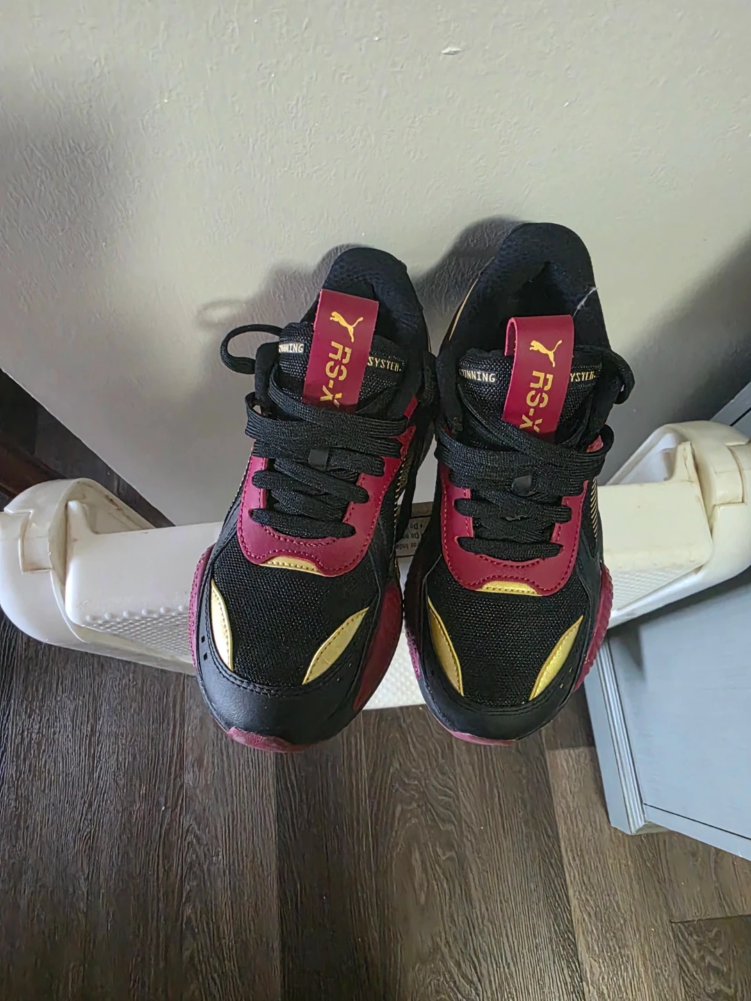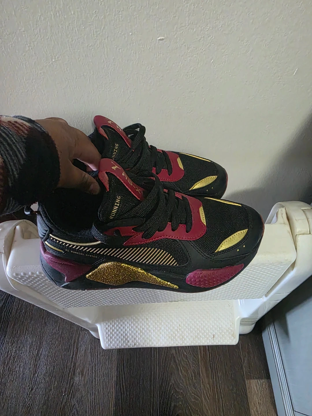 These Puma RS-X shoes are a stylish black, red, and gold colourway. They're designed for comfort and performance. The RS-X line often features a bulky silhouette with layered materials.