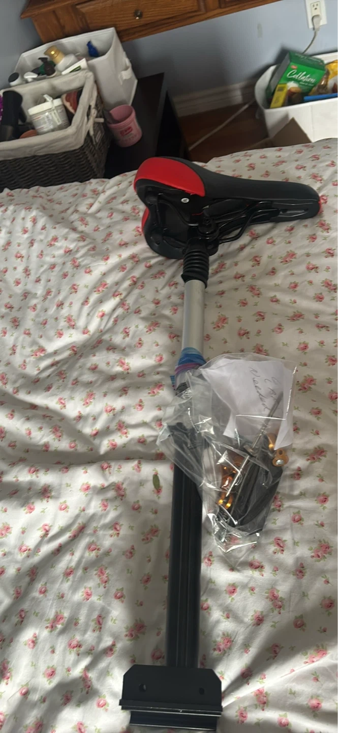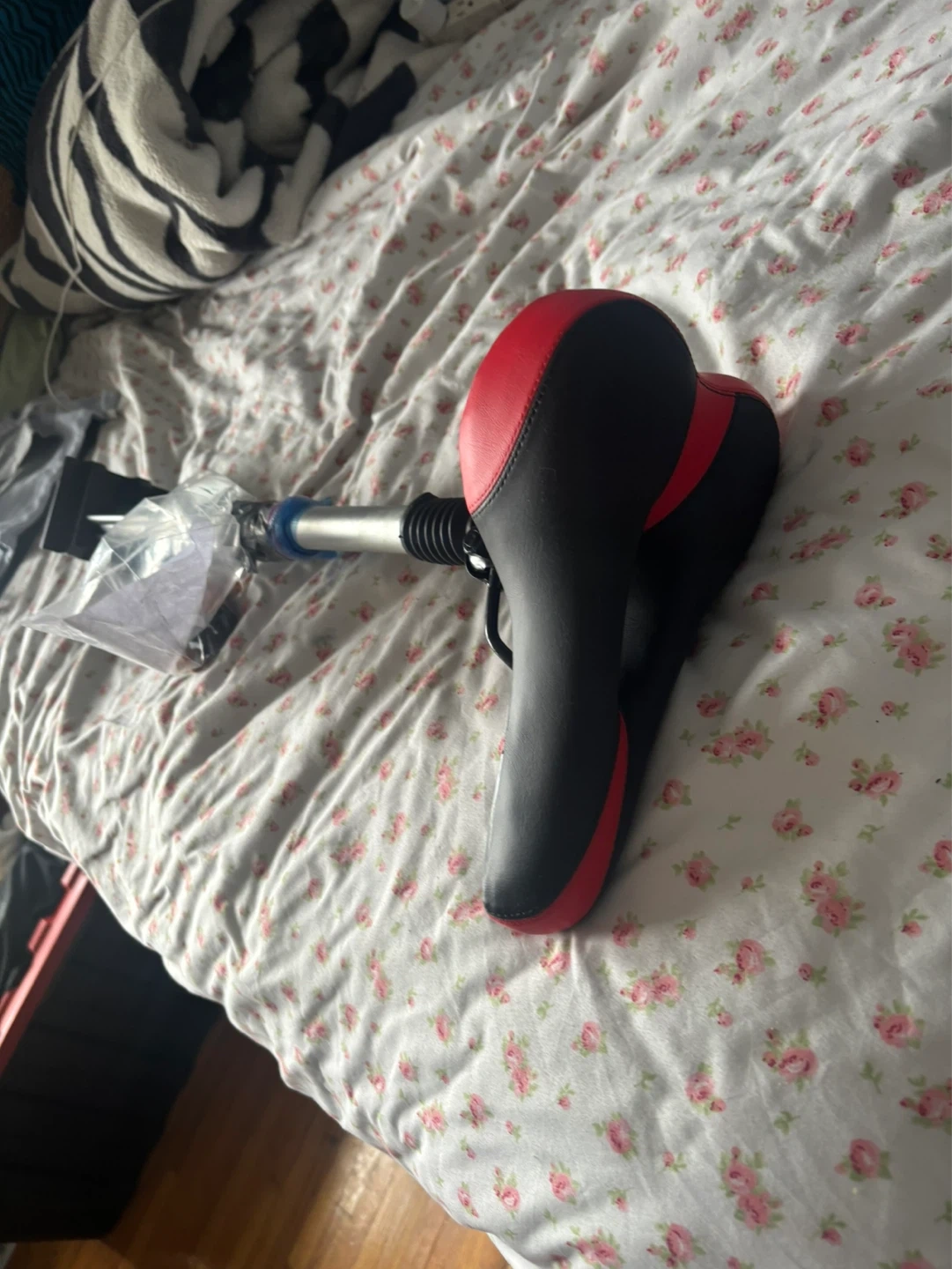 Comfortable red and black bicycle seat with a metal post. Includes mounting hardware for easy installation. This seat is designed for added comfort on longer rides.